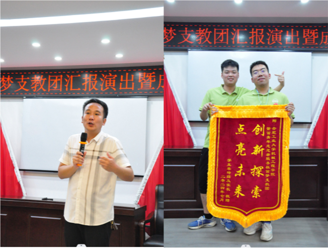 表演結束后,同學們向家長展示了自己前面九天的手工成果,并嘗試向他們介紹一些科普手工的原理,家長無不欣慰點頭,對志愿者們的教學成果及孩子的進步表示認可。最后,“笛夢”支教團的十位志愿者共同上臺,向眾人分享了自己十天的感受與收獲,并輪流為同學們送上了最誠摯的祝福。張店黨總支副書記王斌也上臺發言,不僅對第九屆“笛夢”支教團今年的優秀表現作了總結和表彰,更向所有人提出了明年“接續笛夢課堂”的遠景設想。