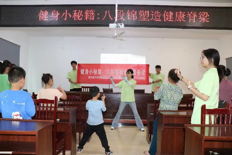 八段錦——作為一種傳統的健身方法,其歷史可以追溯到北宋時期,距今已有八百多年的歷史。作為中國傳統的健身方法,不僅能夠鍛煉身體,提高免疫力,還能幫助放松心情,緩解學習壓力。為豐富留守兒童的課余生活,提高他們的身心健康,培養泰然處之的精神品質,近日,重慶城市管理職業學院智慧康養學院“忠”愛童行,“新”心相印實踐隊前往重慶市忠縣新立鎮新立社區,為當地的留守兒童開展一場生動而富有成效的八段錦活動。此次活動以“傳承國粹,強健體魄,關愛心靈”為核心目標,隊員生動演繹了少兒八段錦的動作要領,通過直觀演示讓孩子們感悟少兒八段錦蘊含的中華傳統文化精髓,以此滋養孩子們的心靈,激發愛國熱情,傳承中華優秀傳統文化。(通訊員 胡霜)