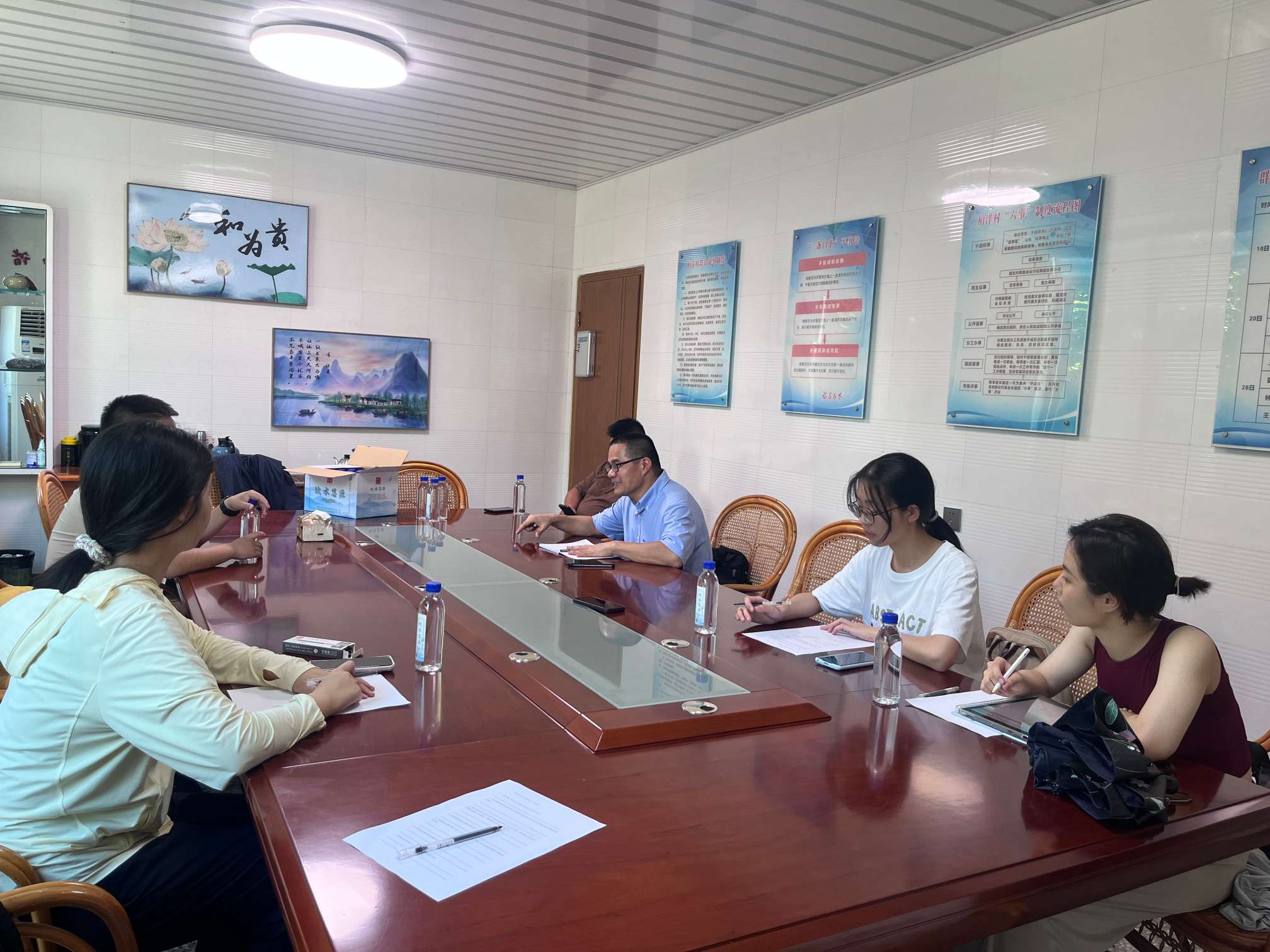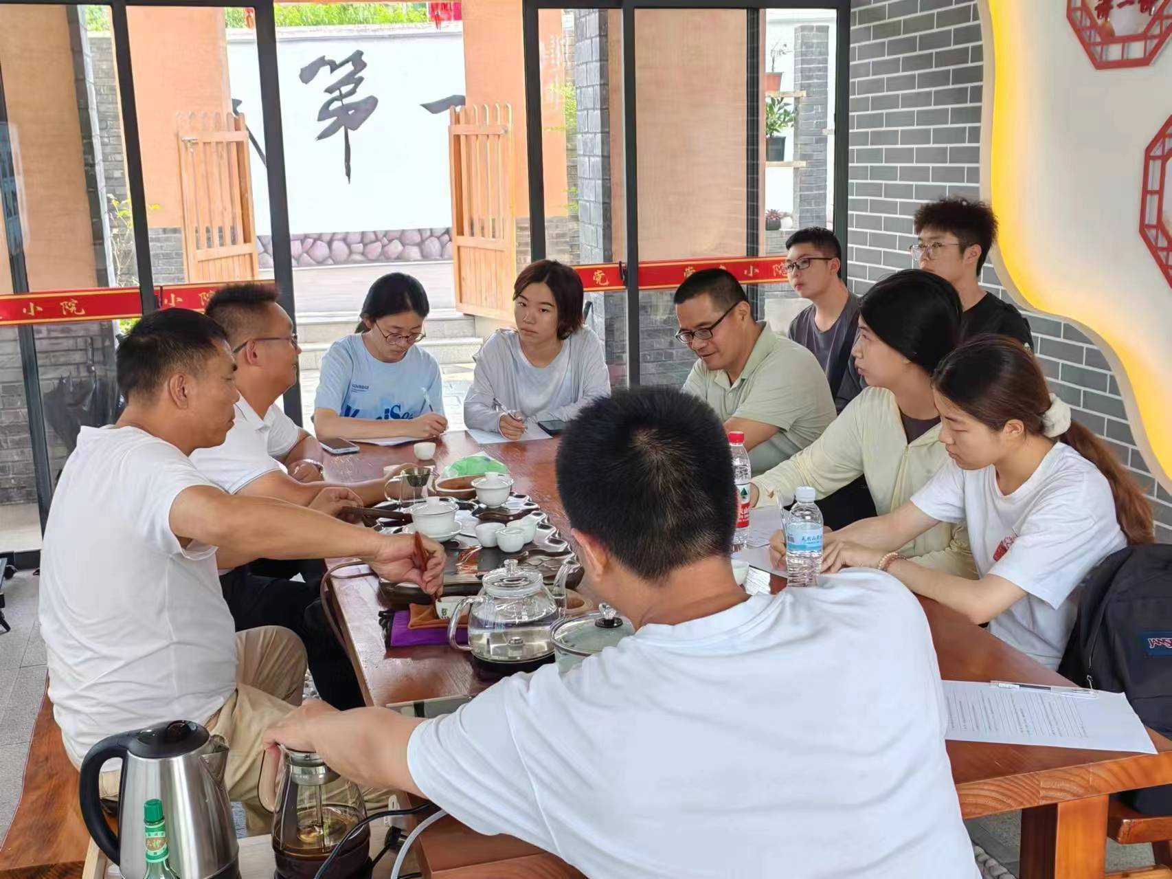 實踐隊成員先采訪了王兆品書記,了解到了柏洋村的鄉村振興情況以及青年的參與程度。王書記指出柏洋村是以產業振興為主要陣地,茶產業的發展提供了大量就業崗位,吸引了許多年輕人返鄉發展。王書記表示希望建立起一套更加有效、充滿活力的鄉村治理激勵機制,提升青年參與意愿,讓越來越多的青年參與到鄉村振興的工作中去。