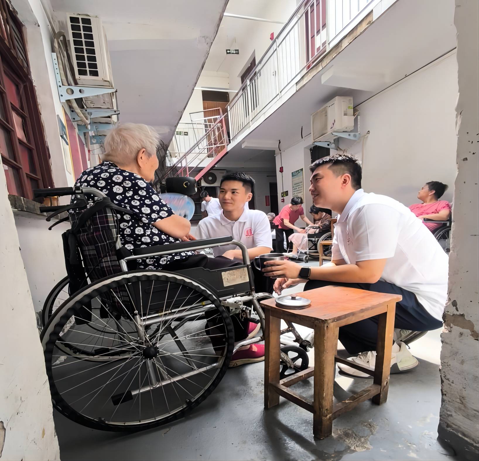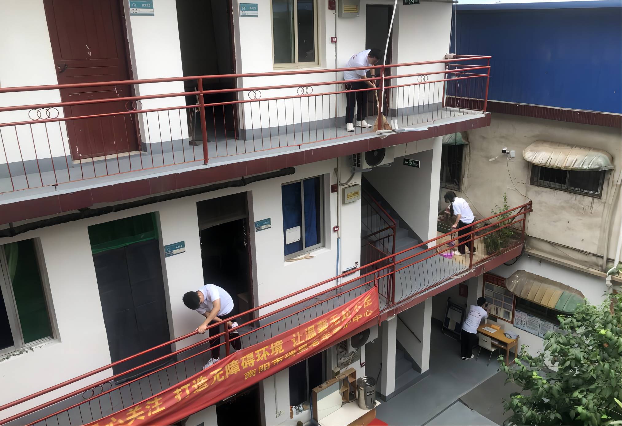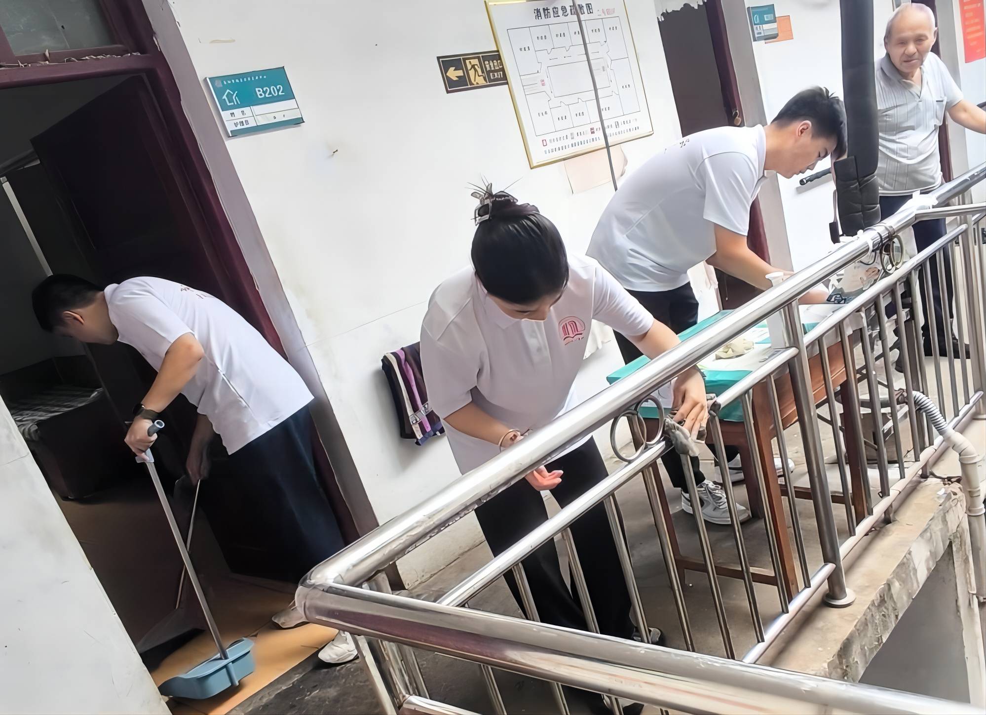 圖為志愿者們在打掃房間、樓道衛(wèi)生。