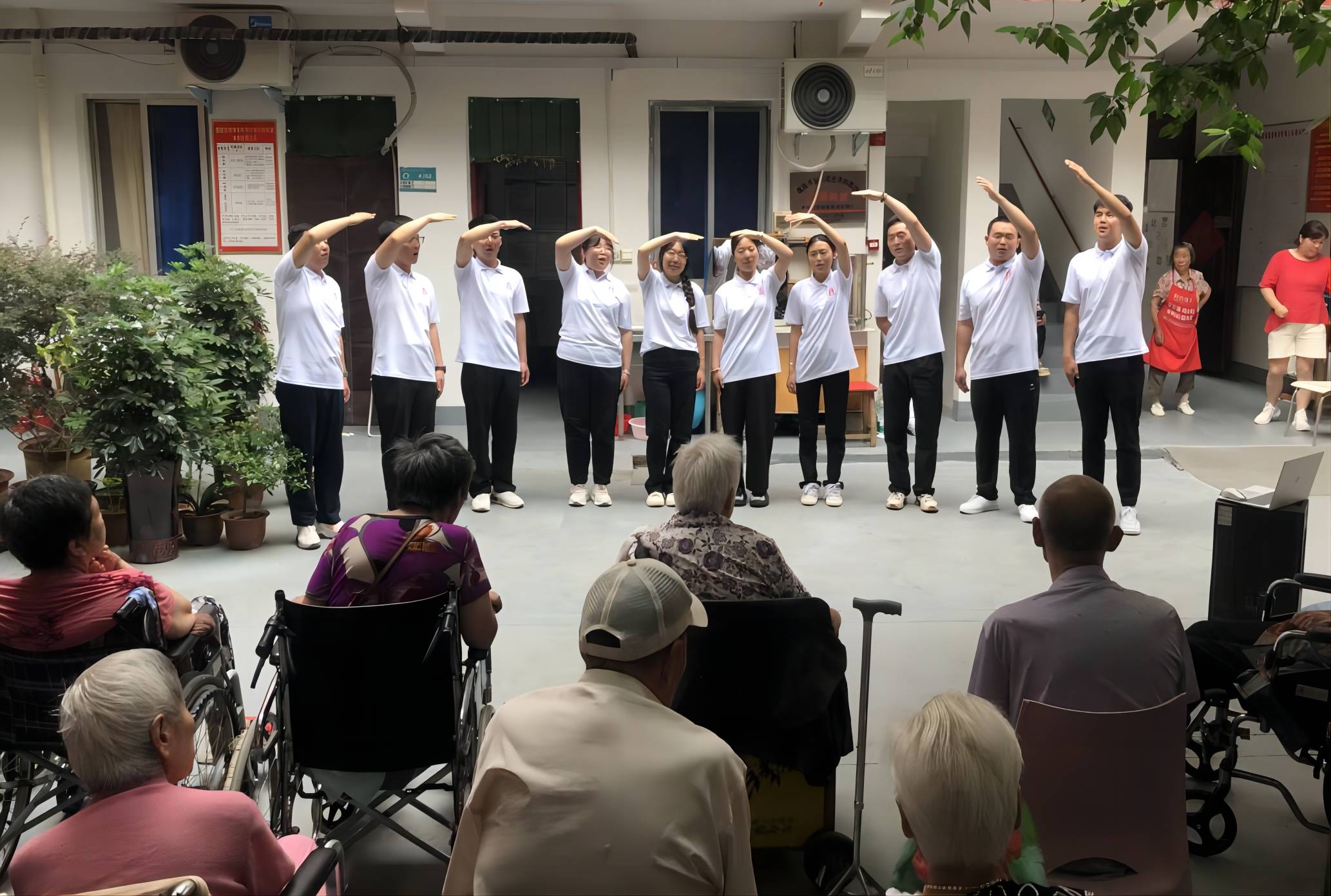 圖為志愿者們?yōu)槔先藗兒铣枨睹魈鞎谩罚麍鲅莩鲈诖蠛铣袌A滿落幕。