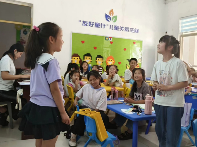 在孩子們寫完作業(yè)以后,志愿者們帶著孩子們玩起了你比畫我猜的游戲。小朋友們積極地參加游戲,他們兩兩密切配合,答對了一個又一個難題。在這個游戲中,孩子們不僅收獲了友情更懂得了如何去和別人合作。