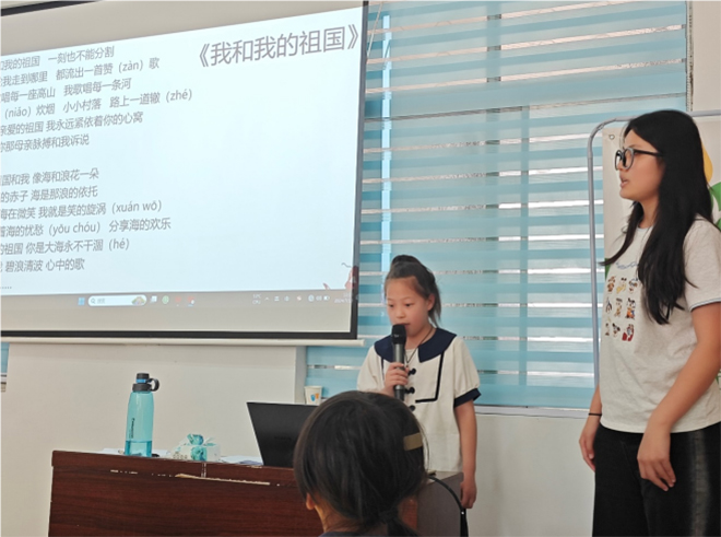 我和我的祖國一刻也不能分割。無論我走到哪里,都流出一首贊歌。相信所有人聽到這句歌詞,心中的自豪感油然而生。第三節(jié)課,志愿者高祺給孩子們帶來了一節(jié)音樂課。高老師教給孩子們我和我的祖國這首歌。當孩子們聽到這首歌的時候,紛紛坐的筆直,眼神中充滿了對于偉大祖國的敬意。在合唱環(huán)節(jié),孩子們用心去歌唱,用這首歌表達他們對祖國母親的愛戴。家是最小的國,國是最大的家。通過這首歌的學習,激發(fā)了孩子們對于祖國母親的愛戴。