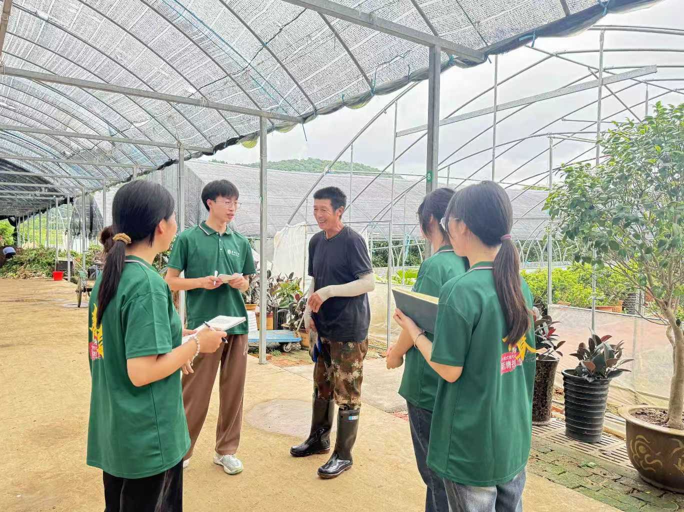 圖為團隊成員與大棚負責人交流 李捷供圖同時,團隊成員還關注了當地的氣候條件、水源供應、土壤質量等自然因素,以全面評估花卉種植大棚的可行性和發展潛力。為深入了解當地大棚花卉種植現狀,團隊成員通過走訪農戶、座談、訪談等方式,與當地農戶進行了深入的交流。在交流中,團隊成員發現當地農戶對于現代農業科技知識了解較少,種植技術和管理方式相對傳統。針對這一問題,團隊成員向農戶普及了現代農業科技知識,重點介紹了新型轉光薄膜技術在花卉種植中的應用及其優勢。通過現場互動,園區負責人和農戶們對新型轉光薄膜技術產生了濃厚的興趣。紛紛表示,將積極嘗試應用該技術,以提高花卉的產量和品質。