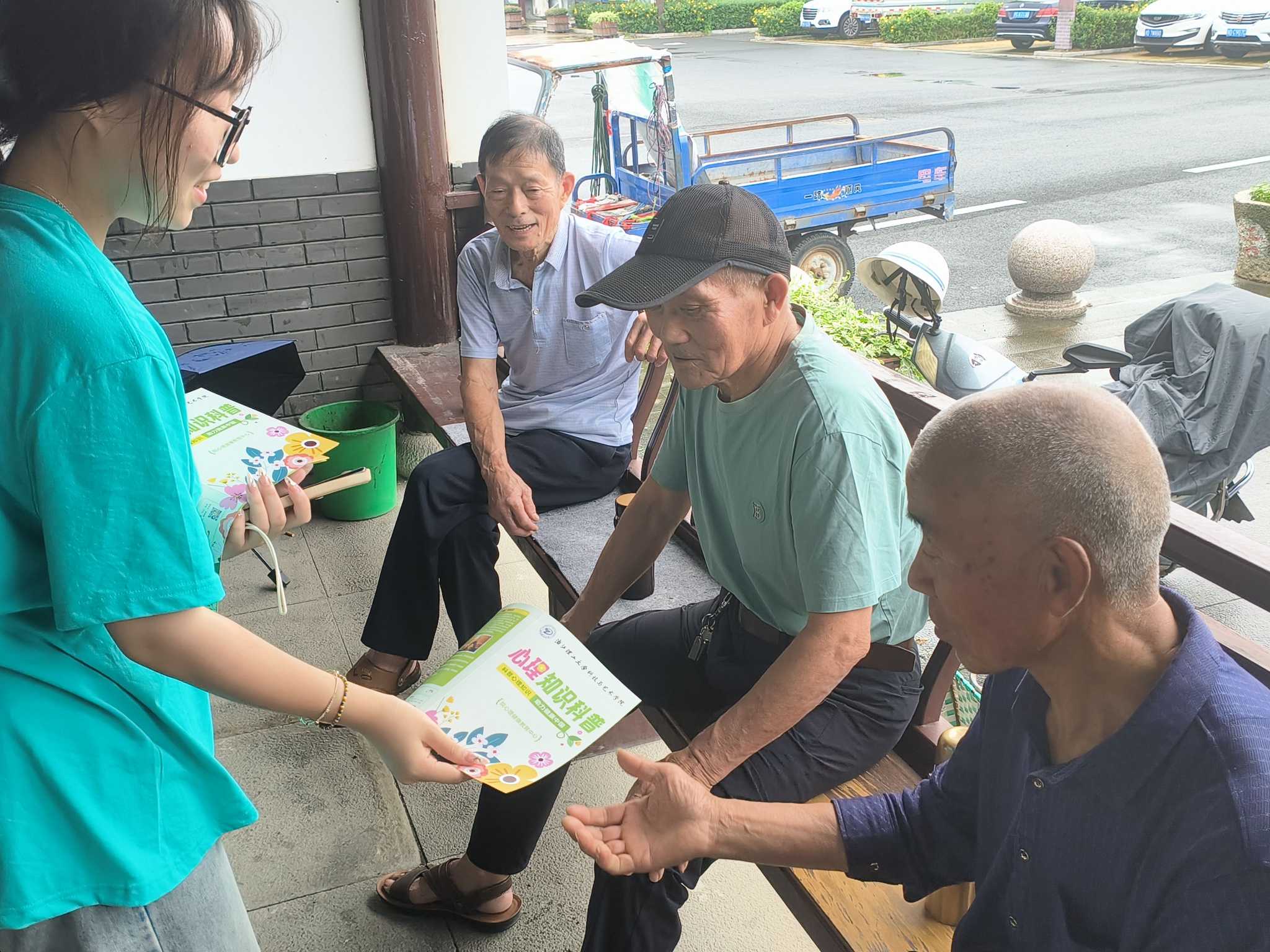 實踐團成員們耐心地向村民們解釋心理健康的重要性,并分享了一些實用的心理調適方法。一些中老年村民積極參與,不僅自己認真填寫問卷,還表示要將宣傳冊帶回家,向家里的孩子傳達心理健康的知識。