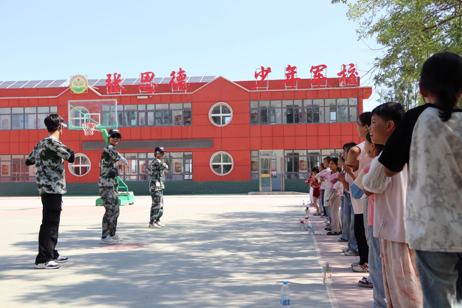 針對(duì)新泉小學(xué)的“少年軍校”特色,支教團(tuán)成員準(zhǔn)備了軍體拳特色體育課程。一拳一掌,強(qiáng)勁有力;一打一踹,整齊劃一;“殺”字鏗鏘,嘹亮回響。孩子們雙目炯炯,神采奕奕,彰顯出少年的血?dú)夥絼偂L(fēng)華正茂。
