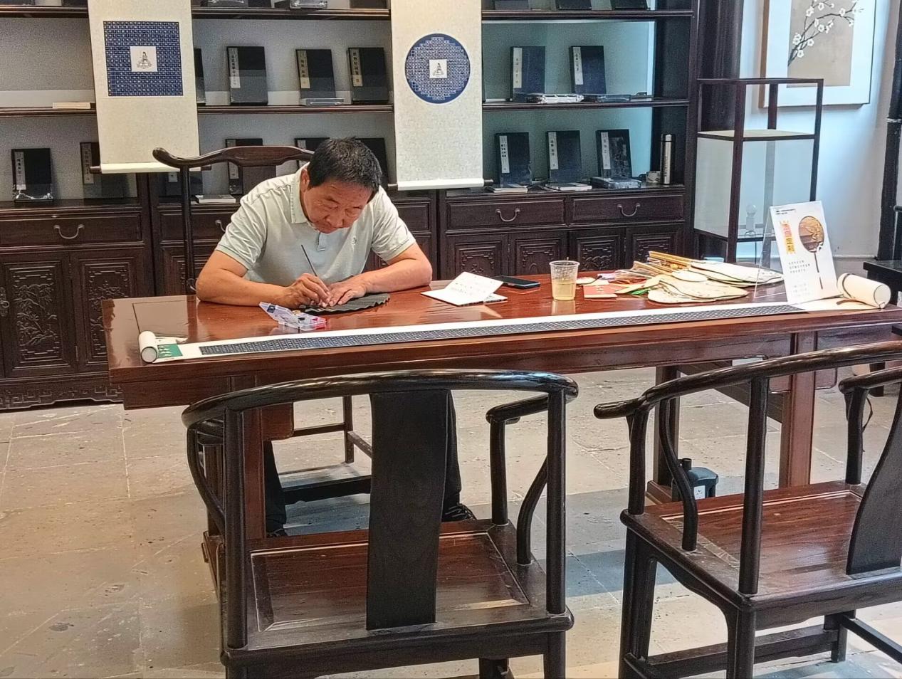 在參觀的過程中,我還遇到了一位正在描金的老先生。他手持毛筆,蘸取調配好的金粉溶液,輕輕涂抹在墨條表面,看似簡單的動作,卻對毛筆的控制和角度有一定的要求,需以穩定的姿勢,確保金粉均勻、細膩地附著在墨條表面。后續通過了解,墨條描金的步驟分為準備階段、清潔墨條、調配金粉、描金、晾曬、檢查與修飾、完成與保存,每一步都需要認真仔細,不容差錯,極考驗細心以及耐心。