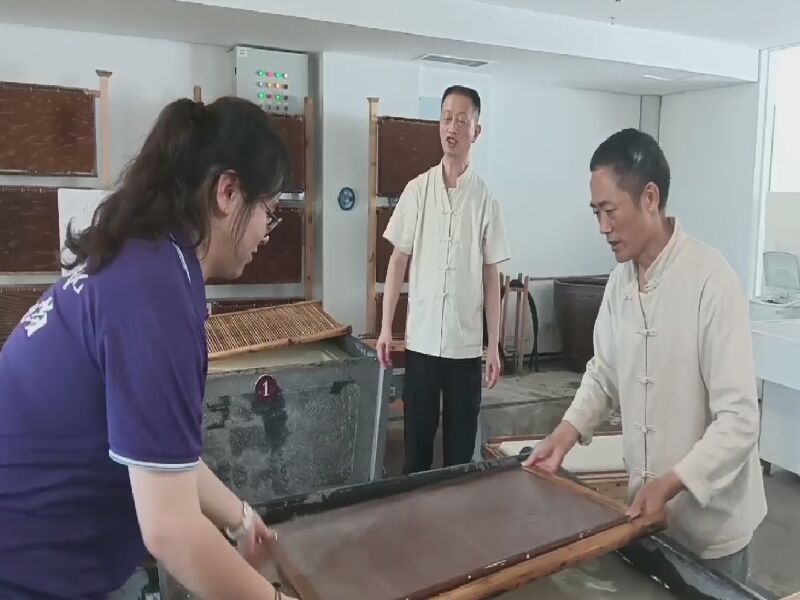 工匠們在現場演示撈紙的過程中,團隊成員李艾佳近距離觀摩并體驗了生肖撈紙。撈紙是宣紙制作過程中最關鍵的一步,工匠們通過撈紙,將紙漿均勻地鋪在竹簾上變成了薄薄的一層紙,隨后經過晾干,便成了一張張完整的宣紙。工匠們通過精湛的技藝使得每一張宣紙都具備完美的質感和韌性。“撈紙真的是一個看著簡單又不十分重要的過程,決定著宣紙的質量。”團隊成員吳憂表示到。