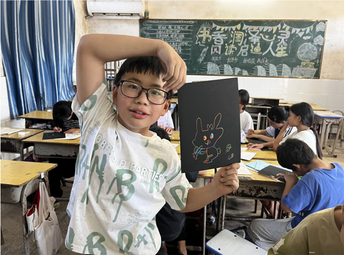 在刮畫課堂上,志愿者耐心地指導著孩子們,鼓勵他們大膽想象、勇于創(chuàng)新。當黑色的刮畫紙在孩子們手中展開,宛如一片充滿希望的田野,等待著他們用創(chuàng)意去耕耘。孩子們的想象力如春風般吹拂,在刮畫中展現(xiàn)出獨特的創(chuàng)意。通過刮畫興趣課,孩子們的藝術天賦得以展現(xiàn),美育的種子在他們心中生根發(fā)芽。這不僅豐富了孩子們的學習生活,更提升了他們的審美素養(yǎng)。