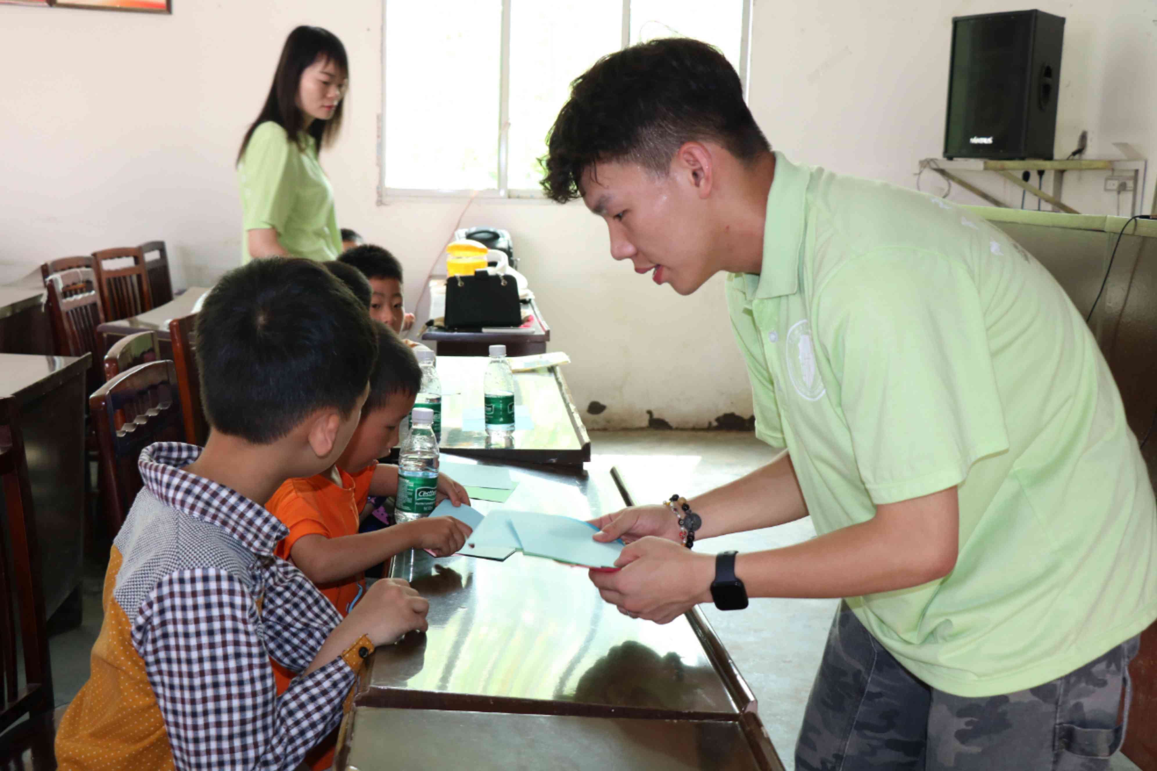 圖為實踐隊員為孩子們分發(fā)卡紙 藍(lán)添宜 供圖