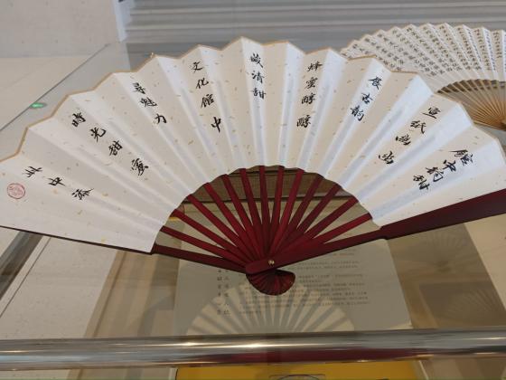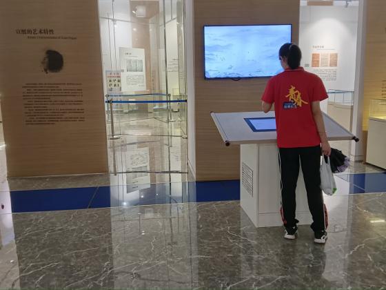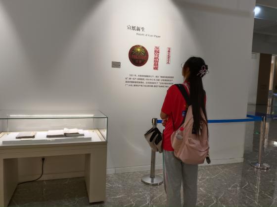 宣紙,作為中華傳統文化的瑰寶,以其獨特的制作工藝和藝術價值,享譽世界。對中國文化宣紙園進一步參觀,一系列由宣紙制成的手工藝品映入學生眼簾。各式各樣不同花色款式的扇子陳列在展覽柜臺上,不同種類不同用途的宣紙也擺放在展示柜之中供游人購買參觀,墨筆硯與宣紙一起擺放,形式古韻優美,古人高雅淡然的氣質悄然綻開。場館中繪畫師在一方長桌上就著筆墨與彩料在折扇與團扇上作畫,墨色在紙上流轉,如同山間清泉,自然而生動。畫家的每一滴墨,每一抹色彩,都能在宣紙上找到它們最完美的歸宿。墨色在紙上緩緩展開,如同云霧繚繞,層次分明,深淺有致。實踐團隊也伴隨著宣紙師傅的講解了解到宣紙的悠久歷史,其獨特的用途與優點均全面的展示在大家面前,時間團隊對宣紙獨特魅力深有體會,不僅是其柔軟細膩的觸感,也是其對墨水的吸收性非常好,能夠展現出墨跡的層次和深淺變化,耐久性很強,可以保存數百年而不褪色,不脆化。宣紙在歷史長河中歷久彌新,恒古流長。