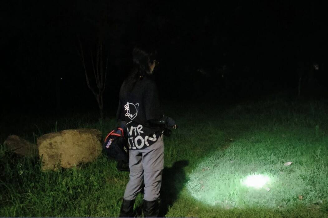 (圖為實(shí)踐隊(duì)員等待草地中出現(xiàn)兩棲爬行動(dòng)物 楊芯雨 攝)