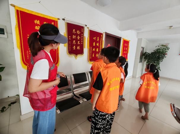 興業海曲世家小分隊的網格員選擇帶領孩子們參觀擁有眾多先進榮譽的社區服務中心。社區工作人員一一講解服務中心中陳列著的錦旗背后的服務與奉獻故事。通過社區工作人員的生動講解,孩子們深刻理解了服務人民與奉獻社區的重要性。
