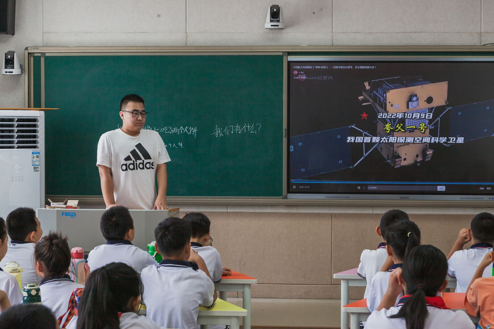 在《中國航天發展史》的課堂上。孩子們隨著隊員的腳步一同回溯這70年史詩長卷。隊員展示了新中國在一窮二白,外部強敵環伺的艱苦環境中,中國航天人從零開始,不懼挑戰,獨立自主探索航天事業。帶著信心與細心,歷經失敗,走過至暗時刻,從東風紅的成功發射到如今天問一號著陸火星,最終創造了我國航天事業的輝煌成就。