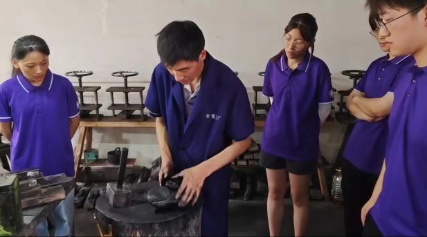 (圖為7月28日,“非遺瑰寶映古今,文房四寶繪書(shū)法”暑期社會(huì)實(shí)踐團(tuán)隊(duì)成員觀察師傅捶打墨條。陳朝暉供圖)