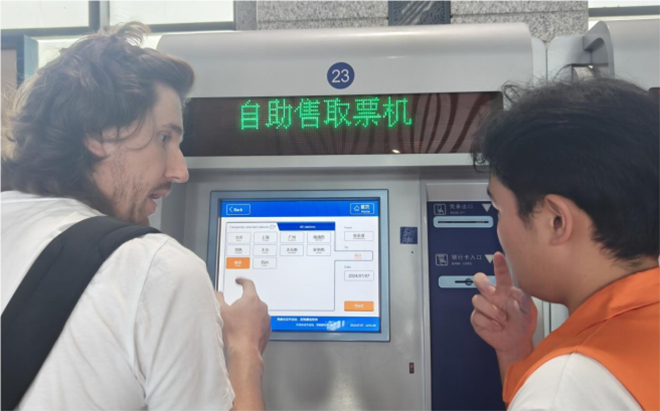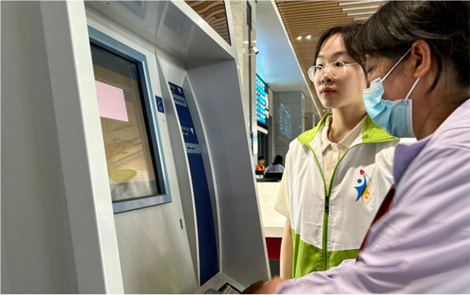 星火實踐者實踐團成員孫雨萱在幫助旅客使用自助售取票機 崔宇杰 供圖