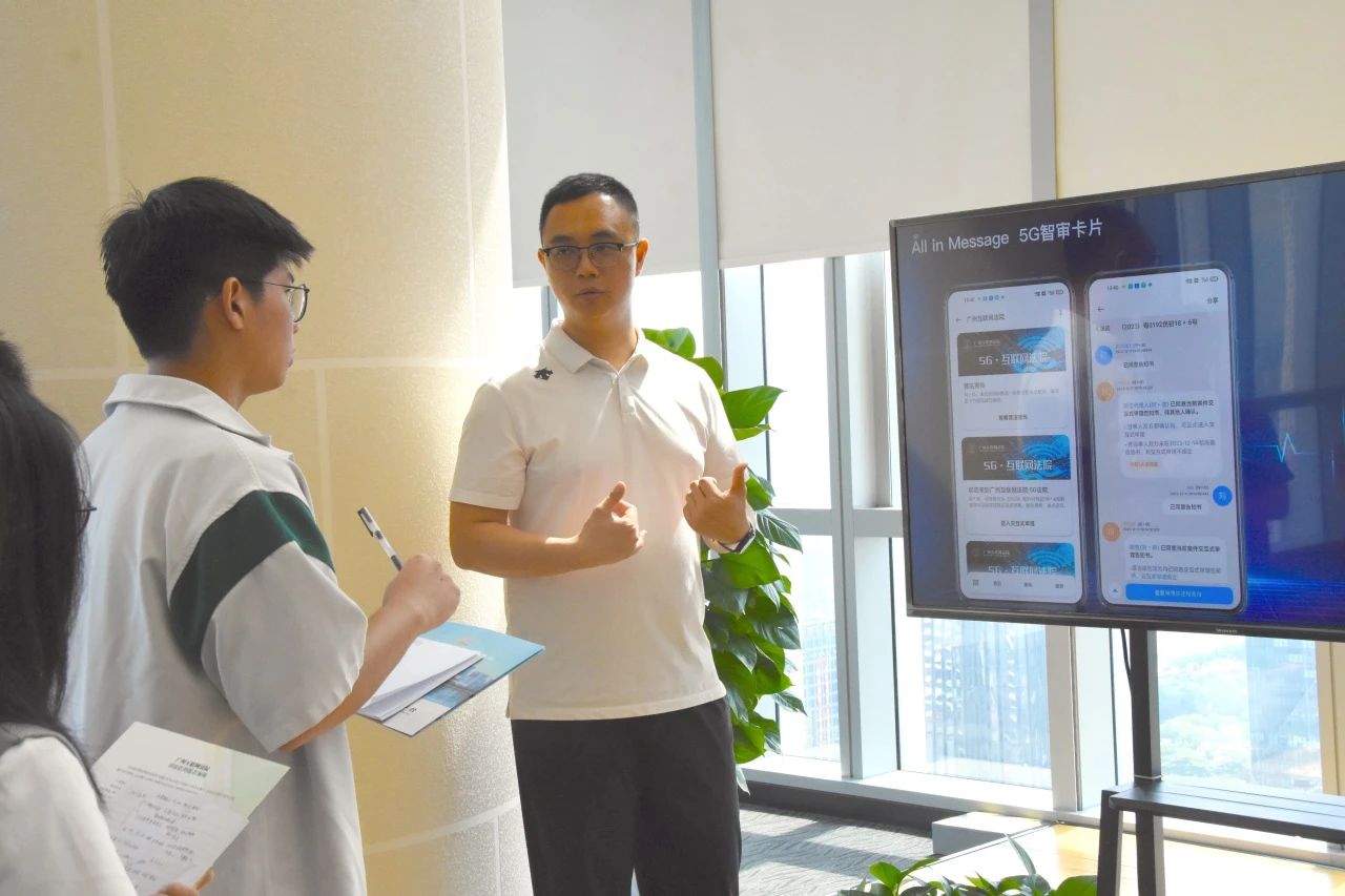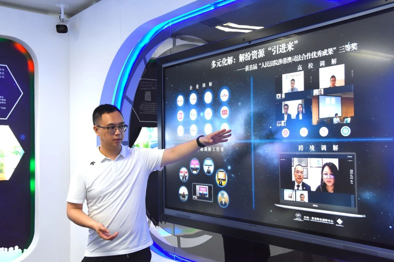 展廳分為“政治為本”、“公正為魂”“創新為源”和“科技為基”四個板塊。其中,“政治為本”板塊展示了廣州互聯網法院在黨建領域的成就,體現廣州互聯網法院過硬的專業水平與政治素養。“公正為魂”板塊展示了廣州互聯網法院審理的“麥某某訴法先生案”“全國首份人格權侵害禁令案”等典型案例,在林法官的細致講解中,實踐隊成員更加深入地了解了互聯網法院運用數據化手段解決司法法律問題的獨特性和開創性。“創新為源”板塊與“科技為基”板塊描繪了廣州互聯網法院的未來發展藍圖,展示了“解紛資源‘引進來’”、“ZHI系統”等數字化解紛途徑,引發隊員們對于通過互聯網法院或信息化手段解決網絡暴力問題的新思考。此外,林法官還向隊員們講解了廣州互聯網法院已經投入使用的5G智審卡片以及E法亭司法便民服務終端,進一步展示了互聯網法院極簡訴訟和高度信息化、智能化的發展趨勢。