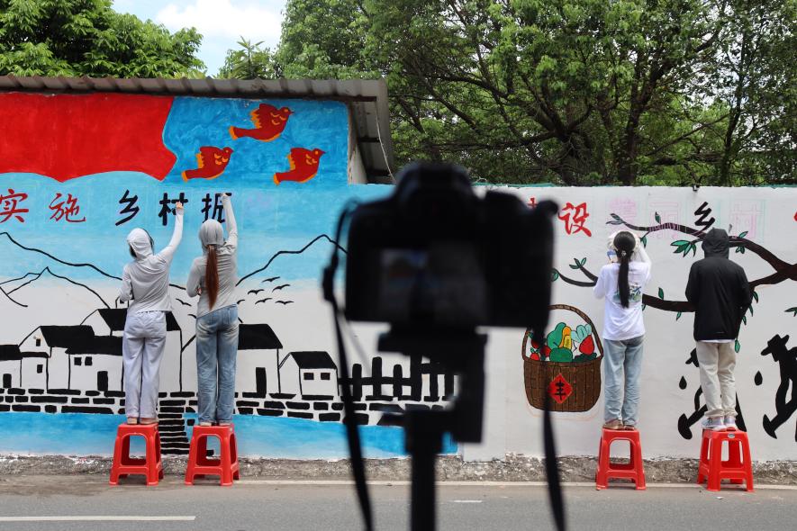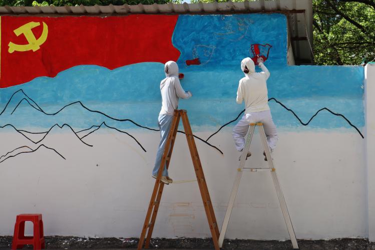 在為期一周的前期籌備中,團隊深入雙下村,與村委密切溝通,深入了解當地文化與歷史,精心設計了融合“歷史、傳承、特色、振興”理念的墻繪圖案。創作期間高溫環境與吃喝不便給團隊帶來了不小的挑戰。面對酷暑,成員們采取了輪換作業的方式,確保了創作的順利進行。此外,由于墻體高度超出預期,團隊在周邊村民的幫助下,借用梯子解決了高空繪畫的難題,展現了村民們的熱情。往來的村民也毫不吝嗇的夸獎墻繪的成果,讓團隊的成員們都感到溫暖和鼓舞。