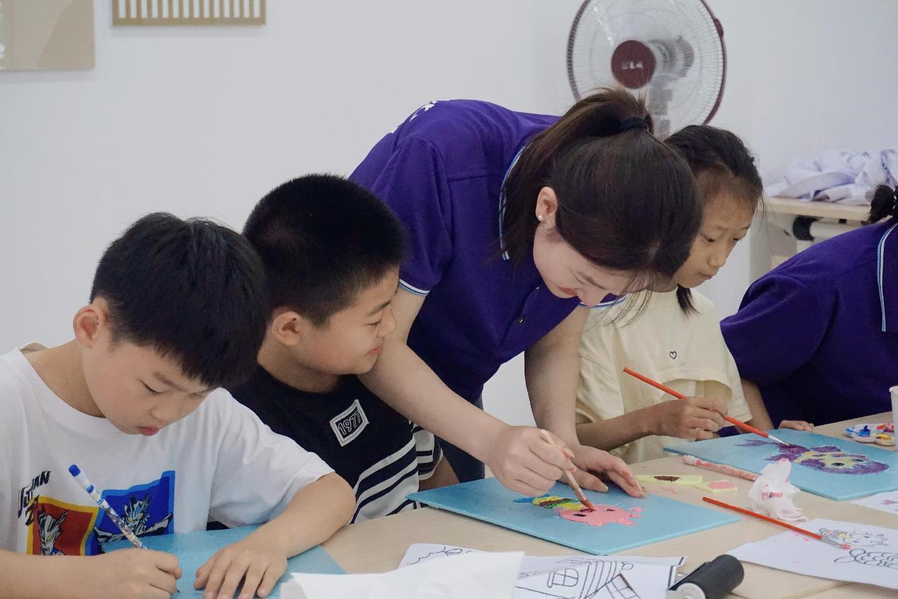 圖為團(tuán)隊(duì)成員馬俊竹幫小朋友們完善版畫。多彩大學(xué)生網(wǎng)通訊員 魏欣悅供圖