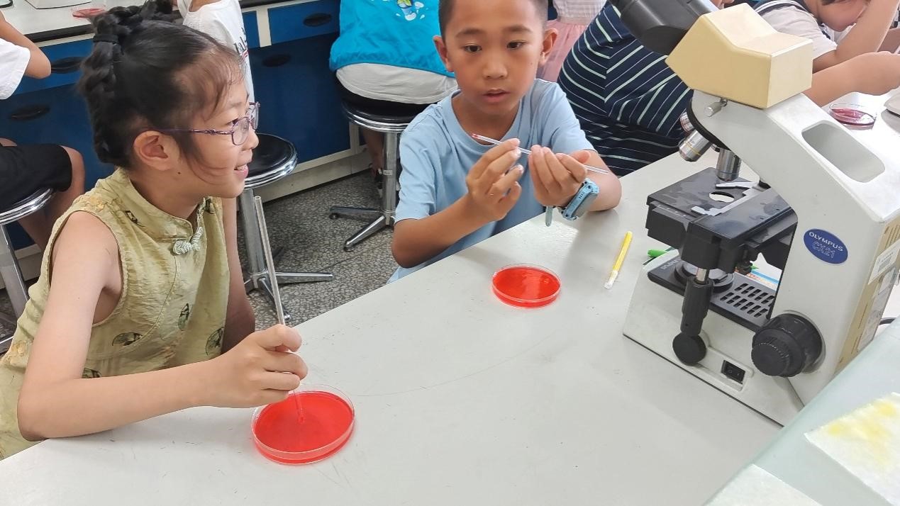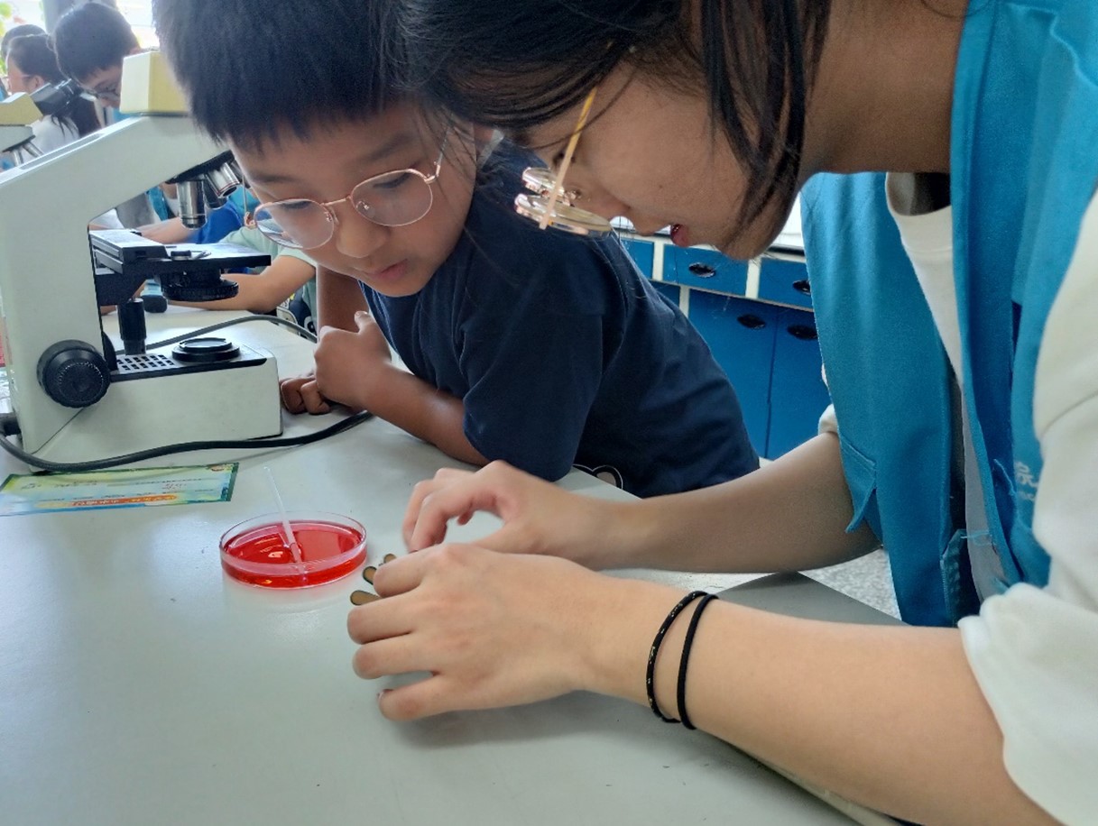 在團隊成員的指導下,小朋友們體驗了三個小實驗,分別為顏料擴散實驗、粗細不同的毛細管吸水實驗、顯微鏡觀察植物根莖中的導管和篩管實驗。