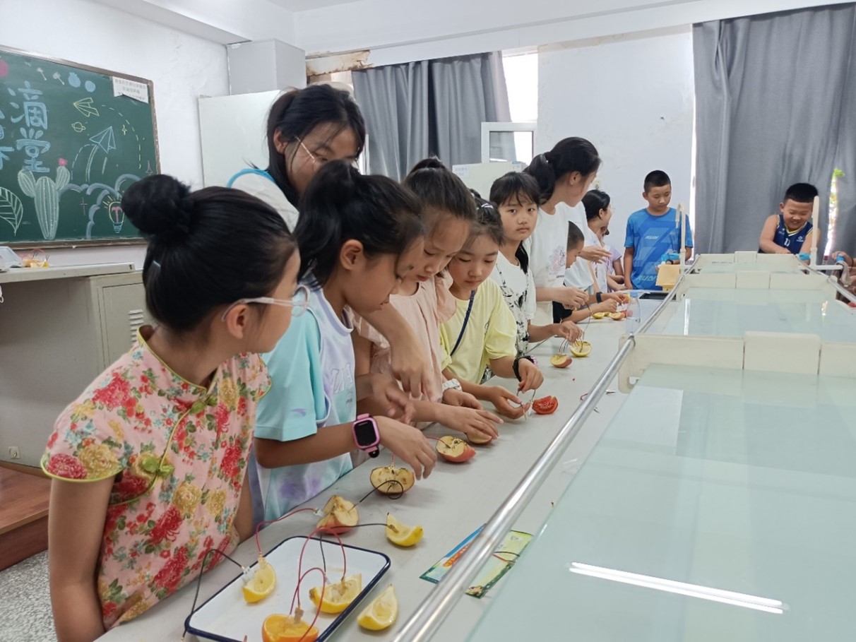 接下來,兩位助教老師進行水果發電演示實驗,并邀請小朋友們上臺親手連接導線和小燈泡。小朋友們分成小組制作水果電池,點亮小燈泡。在團隊成員的幫助下,小朋友們進行超級水果電池連接游戲,小朋友們拍照留念時臉上洋溢著自豪的笑容。