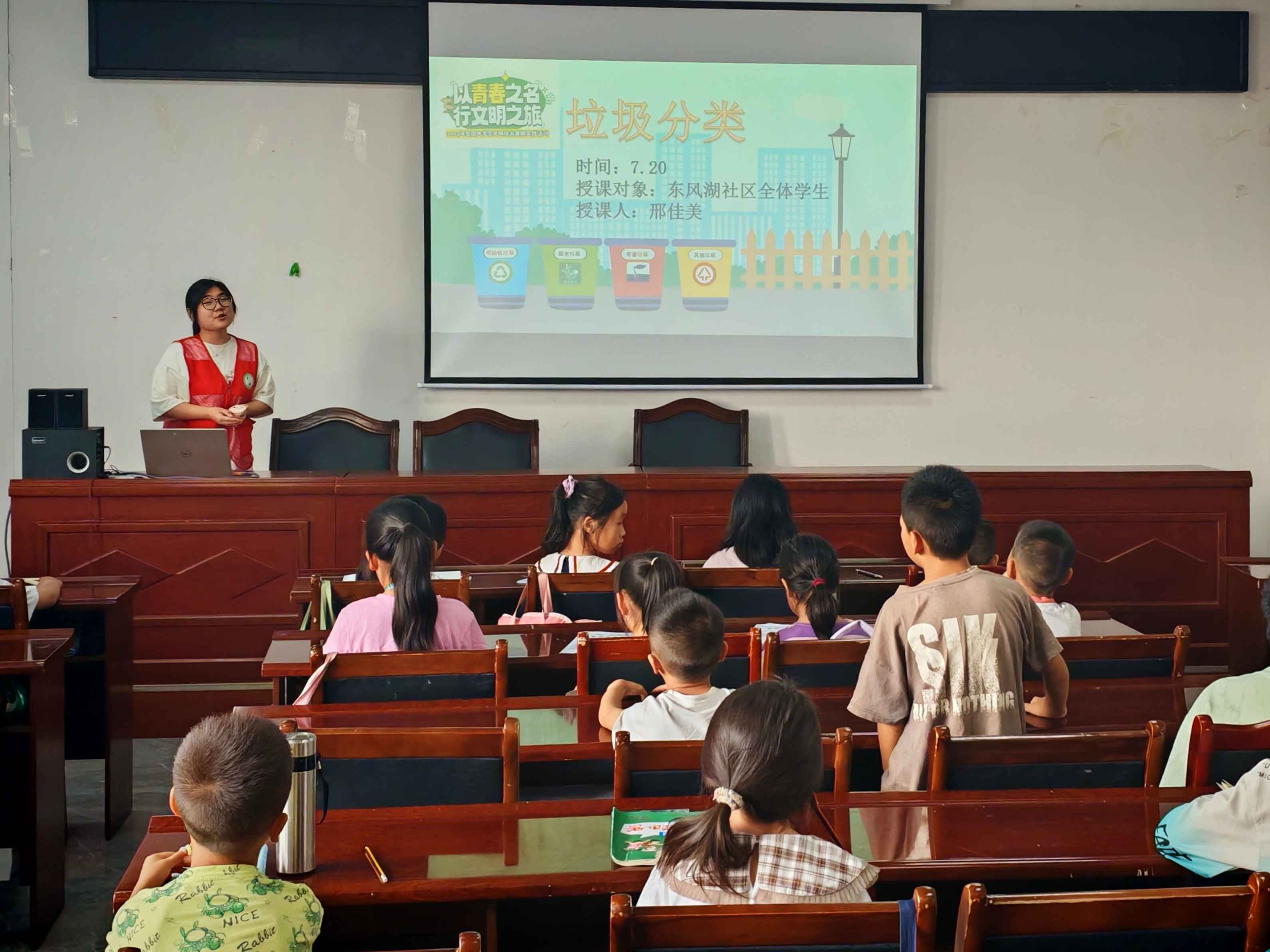 垃圾分類是文明的重要表現。7月20日,服務隊開展了“垃圾分類,文明出行”的主題宣講會,服務隊隊員邢佳美首先向學生們展示可回收垃圾、不可回收垃圾以及廚余垃圾等不同垃圾桶上的標志,以生動簡明的語言講解垃圾的分類標準,隨后列舉易拉罐、破舊的衣服以及廢舊的書本的例子,幫助學生們更好地了解垃圾分類的知識,期間,服務隊隊員邢佳美通過提問和討論的方式,進一步提高學生們垃圾分類的意識和能力,引導學生們自覺培養節約意識,養成良好的文明習慣,最后服務隊隊員邢佳美與學生共同開展“猜猜這些是什么垃圾”課堂游戲,以寓教于樂的教學方式,深化學生們的環保意識,提高學生們的文明素質。