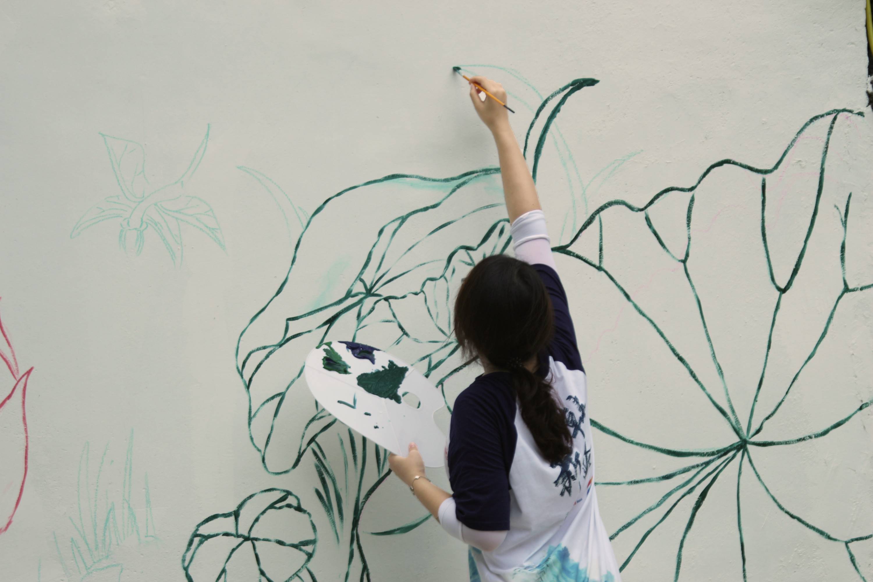 根據墻繪需求,團隊準備了丙烯顏料和以及一系列繪制工具,包括粉筆、筆刷、勾線筆等,確保創作的每一個細節都能得到處理。此外,為了繪制過程的流暢進行,團隊還準備了調色盤和水桶等輔助工具。在墻面的前期工作處理完后,團隊的兩位主力成員先用粉筆在墻面上勾勒出圖案的輪廓,在上色過程中,合理安排其他隊員進行大色塊涂刷以提高工作效率團隊成員分工明確,相互協作,共同初步完成墻繪作品。