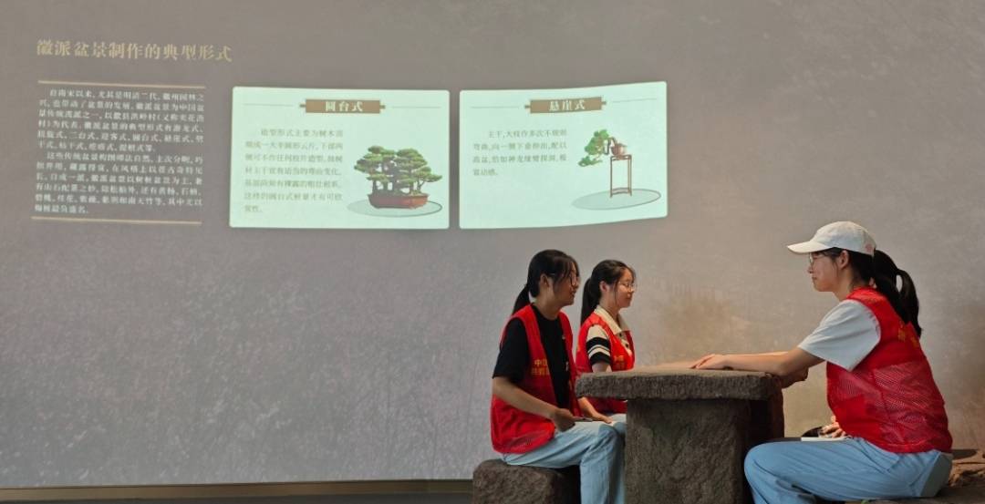 活動的最后一站,實踐團走進了徽派盆景文化展區。徽派盆景以其獨特的造型與精湛的技藝聞名遐邇,每一件作品都仿佛是一幅生動的自然畫卷。學生們在工作人員的指導下,不僅學會了盆景的基本養護技巧與造型方法,更深刻體會到了徽派盆景所蘊含的自然之美與人文情懷。他們表示,要將這份對自然的熱愛與敬畏之情帶回校園、帶向社會,讓更多的人了解并愛上徽派盆景文化。
