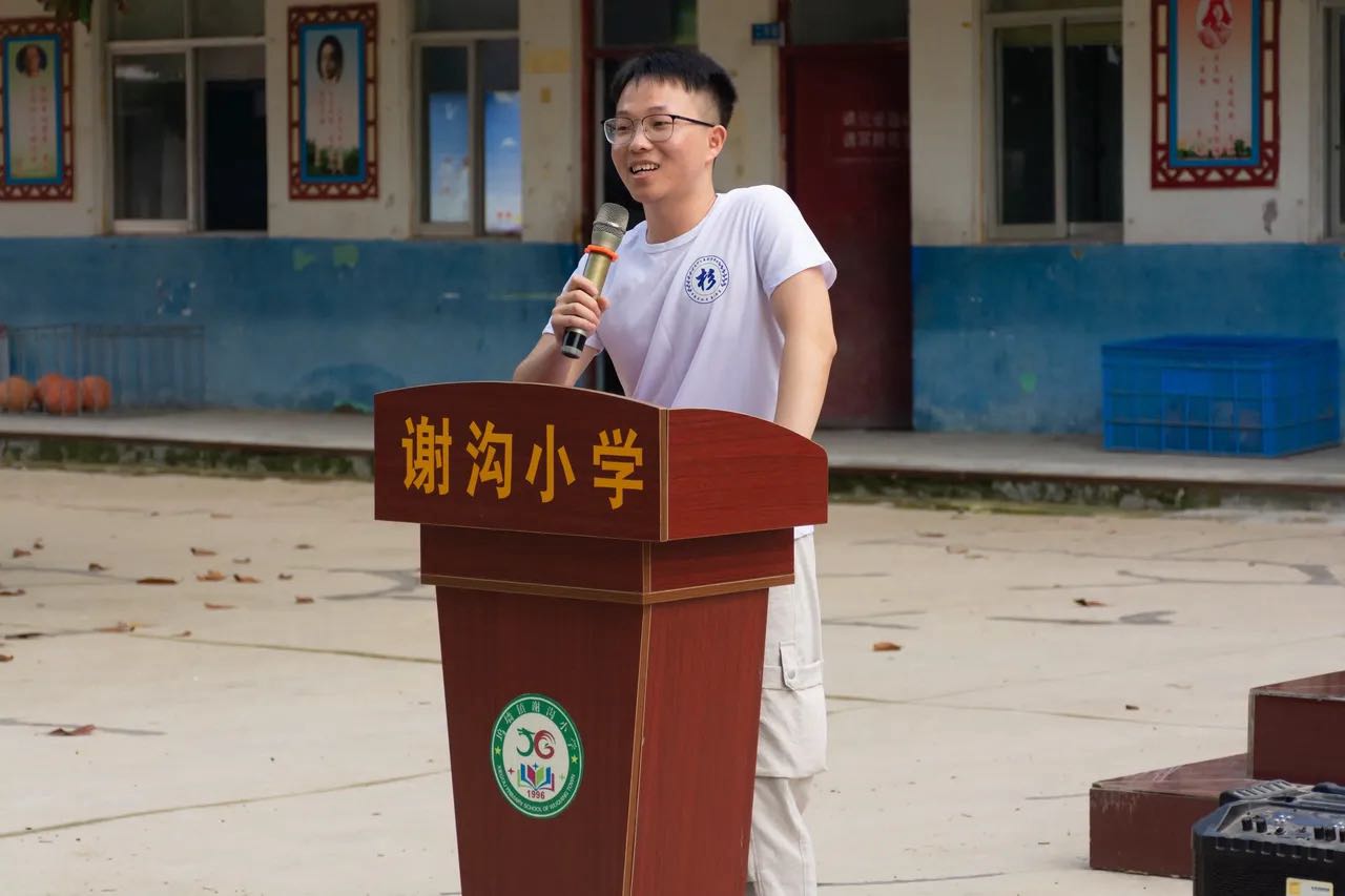 上午七點,支教隊隊員于學校門口迎接學生并引導其入班,開始早自習。早讀結束后,學生進入升旗場,按照年級列隊,開營儀式正式開始;顒右潦,謝敏峰代表謝溝村村委會與謝溝小學全體師生向豫見石光支教隊表示熱烈的歡迎與感謝。同時,謝敏峰寄語學生:要珍惜此次夏令營的機會,認真學習,爭取在夏令營中獲得新知識,掌握新技能。隨后,支教隊隊長王心宇代表全體支教隊員向學生做團隊及團隊成員的介紹,對謝溝小學的支持表示感謝。隨后,支教隊員依次上臺做自我介紹。開營儀式結束后,各班班主任帶領學生有序帶回教室。先是師生之間的自我介紹,然后是各種破冰小游戲的開展。通過“松鼠搬家”、“猜謎語”等小游戲的開展,師生之間有了進一步的了解。