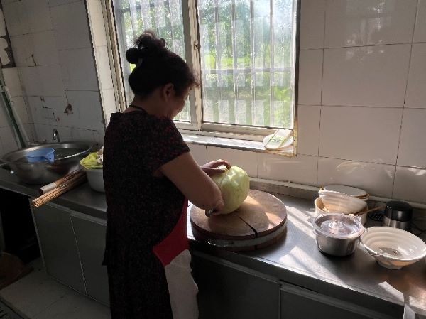為了對養老院的環境有個大致了解,成員們隨后參觀了食堂,此時還是上午,食堂的工作人員正忙碌地準備今天的午餐。蝦仁炒玉米、番茄炒雞蛋、絲瓜毛豆湯……兩葷兩素一湯是這里的標配。“我們有專門的菜譜的,可以做到是一周七天不重樣,還營養均衡。”廚師長驕傲地向推進團成員們介紹。