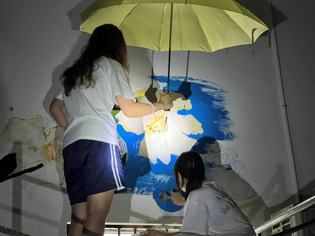 圖7 隊員在雨夜堅持作畫(攝影:華南師范大學 范霈誠)