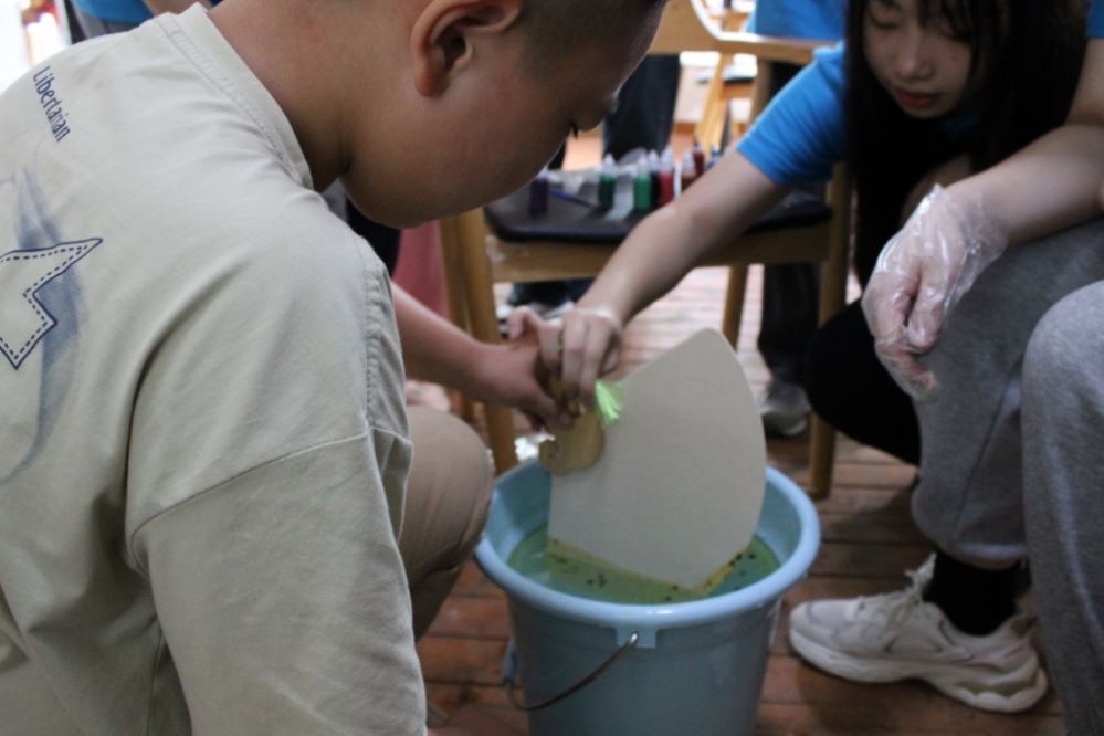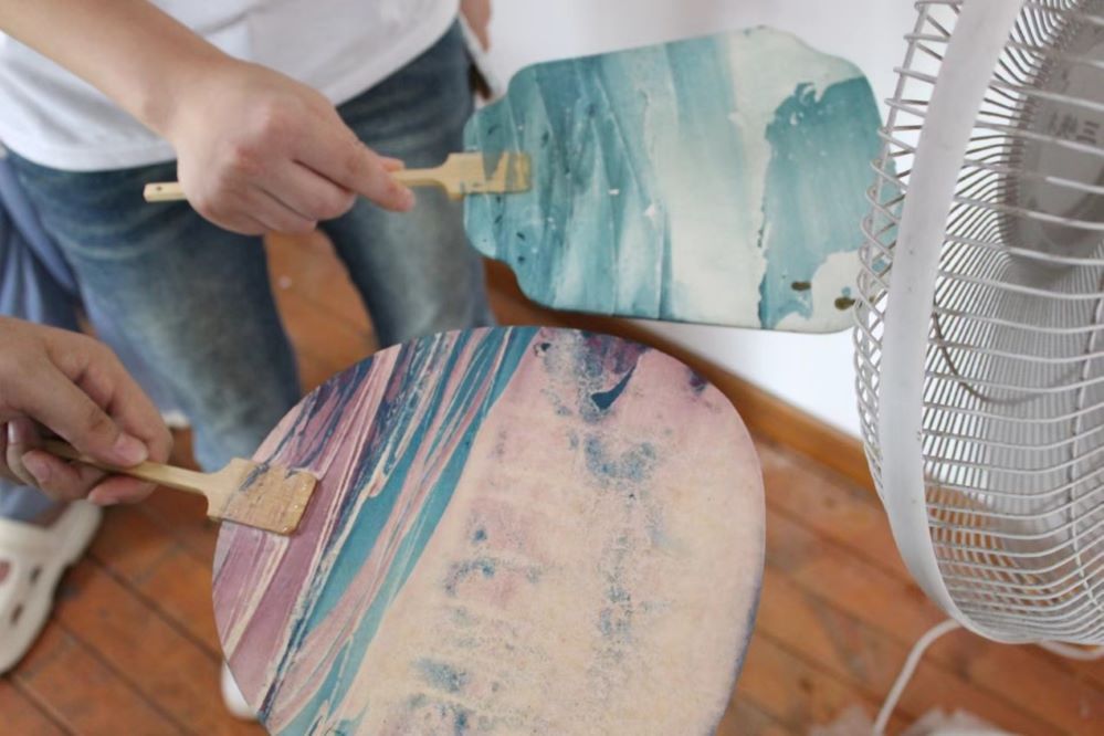 接下來是漆扇體驗活動,為了保證小朋友們的安全,漆扇制作用到的大漆由實踐團的成員們為小朋友滴,小朋友們說她們要什么色,由實踐團的成員為她們配置用量,實踐團的成員和小朋友們配合的很好。最終小朋友們做出來的扇子各不相同,但各具特色。