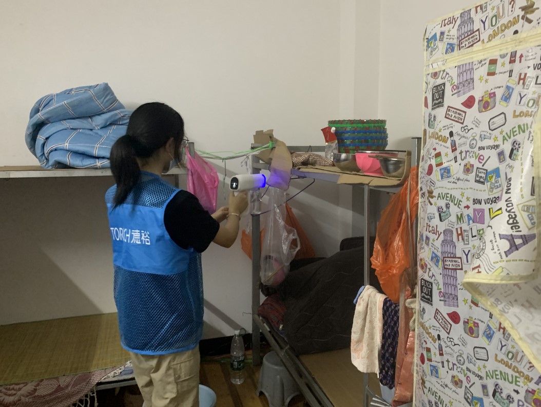 從全方位對農民工人宿舍消毒除菌與清潔,擦拭桌面、窗臺、柜子,掃除灰塵拖去污漬,清掃后用酒精噴灑除菌,確保居住環境的干凈衛生,到一絲不茍地打掃廚房衛生,整理廚房臺面物品、擦拭廚房臺面、清除櫥柜污垢,全力保障飲食衛生。在烈日炎炎的盛夏,突擊隊開展了充滿關愛的夏日“送清涼”活動,還特意準備了防暑必備的藿香正氣水,隊員向叔叔阿姨們介紹藿香正氣水的使用方法和功效,提醒他們在高溫勞作時要注意防暑降溫。