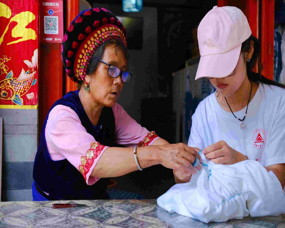 在與奶奶的交流中了解到,她的兒子大學畢業后回鄉將扎染文化與現代藝術相結合,開創青白扎染坊,創新出許多新穎別致的扎染工藝品,利用網絡時代的優勢,將其發表到微博、小紅書等平臺,并且與現代旅游業結合,開通電商渠道銷往全國各地,促成扎染的創新性發展。兩位老人還帶過往屆學徒,為的就是不能讓老祖宗的技藝失傳。老一輩人的堅守,新一代人的傳承,正是守正創新的真實寫照,周城扎染是我們寶貴的文化瑰寶,我們應不忘本來、與時俱進,助力中華優秀傳統文化新發展。