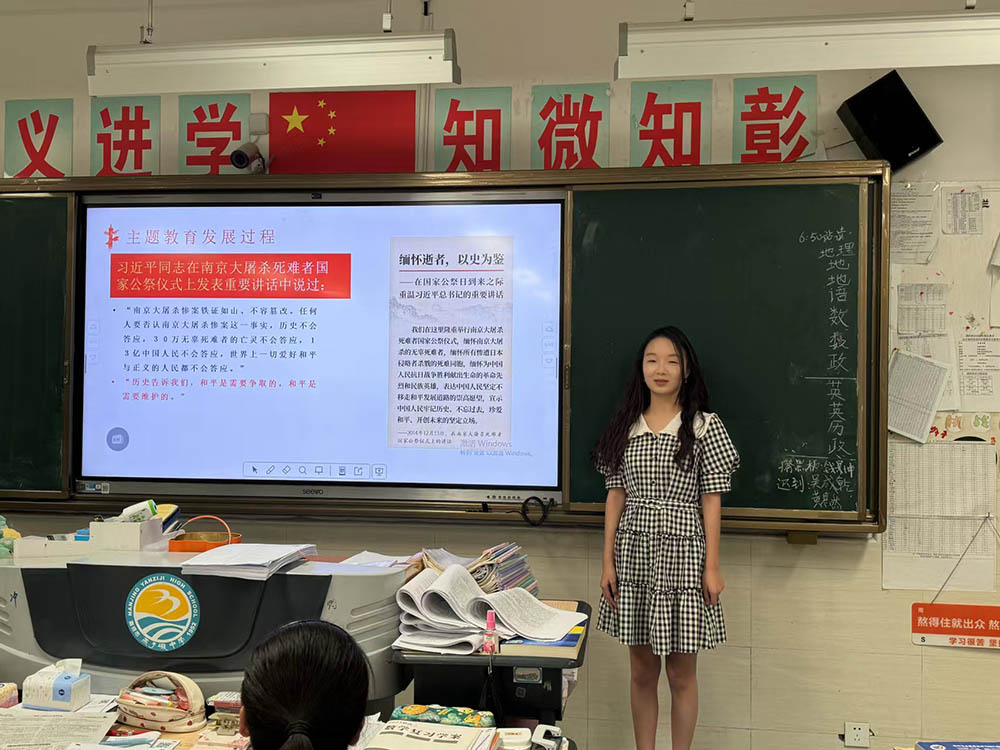 參觀完紀念館后,團隊成員來到南京市燕子磯中學,以習近平新時代中國特色社會主義思想為基,利用在館中有關照片進行宣講活動。旨在讓同學們意識到,銘記歷史與珍愛和平從來都是不可分割的。青年們在習近平新時代中國特色社會主義思想一思想的指引下,銘記歷史是為了更好地開創未來,而守護和平則需要青年們共同的努力和行動。同學們在本次宣講中深刻領悟黨的領導、領袖領航、制度優勢、人民力量的關鍵作用。依據習近平新時代中國特色社會主義思想中的“人類命運共同體”理念,只有匯集愛國情感的力量,構筑民族記憶共同體,國殤民難才不會重演,和平的力量才會在國民的緬懷中凝聚。為此青年們應該共同攜手,反對戰爭,維護世界和平。
