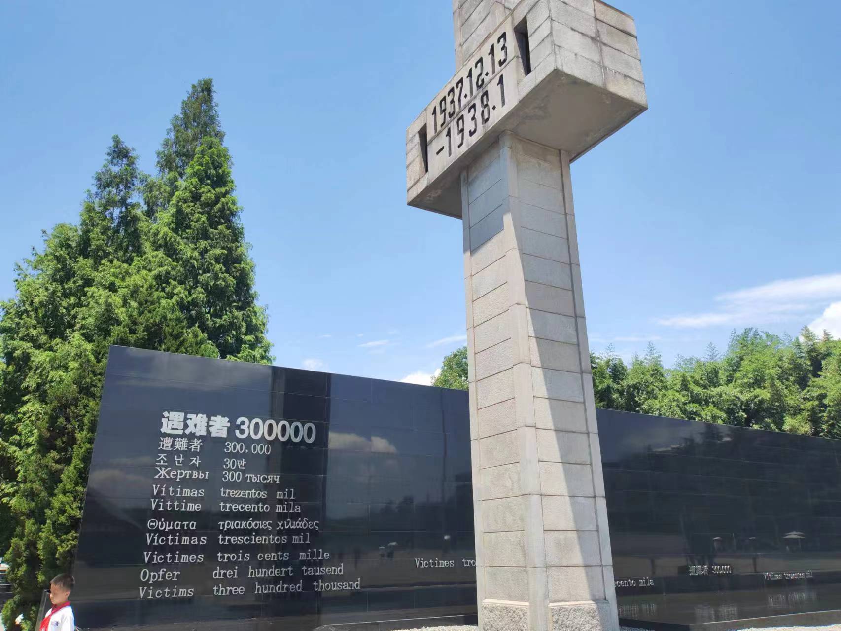 隨后團隊來到集會廣場災難之墻上面刻有中、德、韓、西班牙等11種文字的“遇難者300000”。旁邊十字架型的標志碑下鋪著一層層碎石,意味著紀念館是建立在萬人坑遺址之上的。