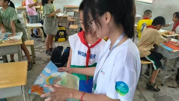 實踐團成員先向學生們普及了美術基本知識,為他們科普調色技巧和三原色配色知識。學生們豐富的內心表達讓干凈的白紙變得五彩斑斕。他們紛紛拿起畫筆,繪出了自己心中的世界。這些畫作展現了孩子們豐富的內心世界,也讓他們在創作的過程中盡情地表達與釋放,培養自信心與尋找自我認同感。而后實踐團成員對個別繪畫畫面表現得比較特別的小學生進行了深入的溝通交流,了解學生畫面表達的內容與情感,并對積極的情緒情感進行鼓勵,對表達出較消極情緒情感的小學生進行了情感開導,幫助他們認識自己的內心,勇敢面對自身情感發展。