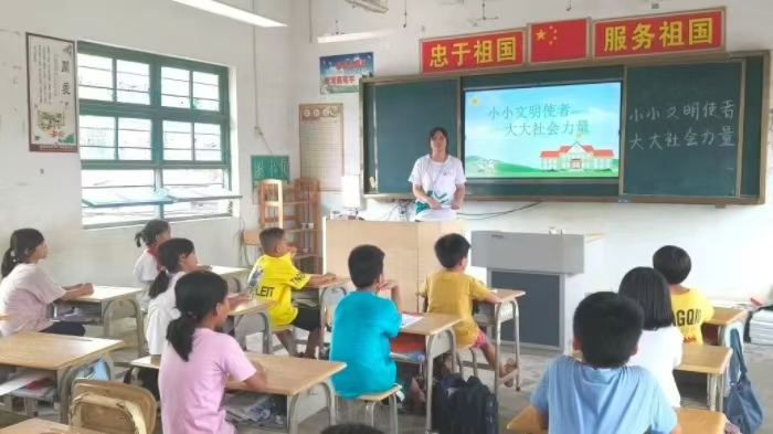 湛江科技學院艾在陳及實踐團接著又開展了一場以“小小文明使者,大大社會力量”為主題的衛生宣講活動。活動中,實踐團成員通過生動的講解和互動游戲,讓學生們進一步了解衛生知識,包括正確刷牙、勤洗手、保持環境清潔等日常衛生知識,寓教于樂的課堂形式為他們帶來互動且具有啟發性的課堂體驗。引導學生們成為校園內外的衛生宣傳者和實踐者,用自己的行動影響身邊的人,共同營造一個更加健康、文明的社會環境。