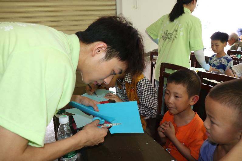 圖為實踐隊員幫助留守兒童裁剪卡紙。 藍添宜 供圖