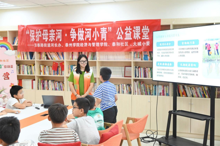 在開展家鄉巡河護河行動的同時,經濟與管理學院與泰州京泰路街道河長辦、泰和社區以及大城小愛公益服務中心聯合舉辦“保護母親河、爭做河小青”公益課堂,為社區孩子帶來一場精彩的河流保護知識科普。通過直觀的展示和詳盡的解說,孩子們不僅深切領悟到河流對于生態環境和人類生活那無可替代的重要性,也清楚地知曉了當前河流所面臨的嚴峻問題和巨大挑戰。相信在未來的日子里,這些孩子必定會將所學的知識轉化為實際行動,成為意志堅定的河小青。