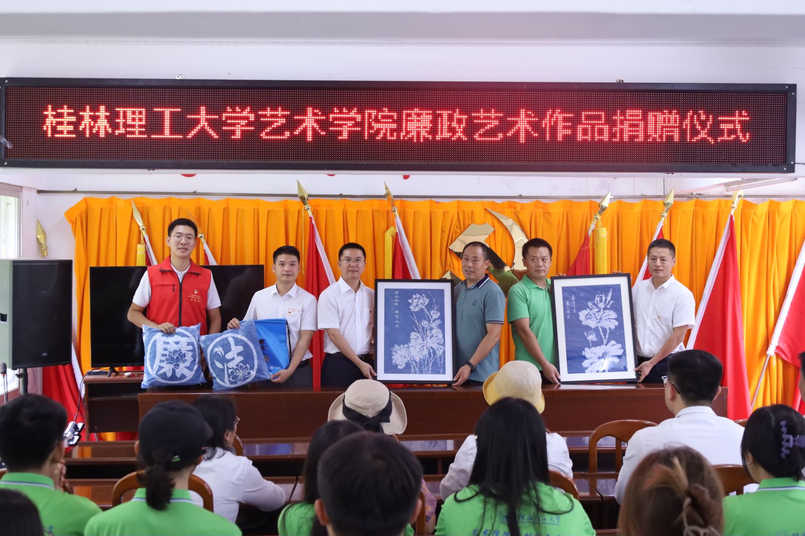 助力鄉村振興藍圖,綻放藝術之花 桂林理工大學響應“全面推進鄉村振興”,“統籌鄉村基礎設施和公共服務布局,建設宜居宜業和美鄉村”,在學院書記領導下,成員們走進灌陽縣三樹村、大源村以及東陽村。在三樹村進行了非物質文化遺產蠟染工藝作品的捐贈,通過“清廉立身,正氣傳世,共筑廉明未來”為主題,讓廉潔與藝術結合賦能鄉村振興,以多樣化手法多角度參與鄉村建設,讓清正廉潔走進鄉村,留下兩袖清風之印。
