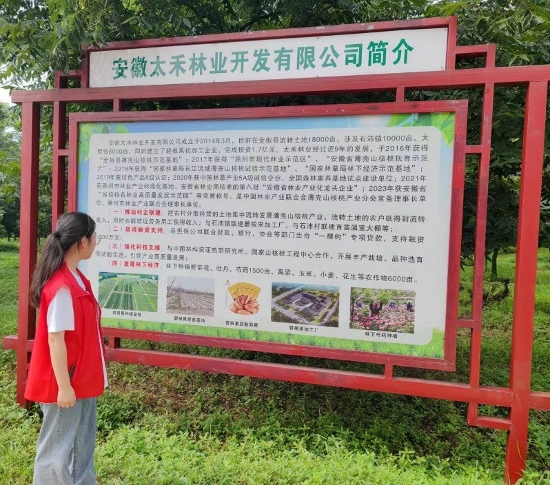 在碧根果產業介紹區,大學生們認真觀看著介紹區展示牌上的詳細講解。這里展示著石沛鎮碧根果產業的發展歷程、種植技術的革新以及主要分布區。