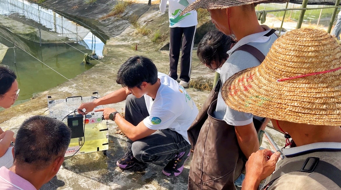 “漁”躍鄉村實踐團在都斛村東利漁場實地調試研發的智慧羅非魚苗運輸多參數監控設備