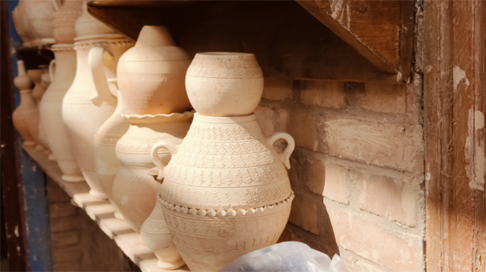 喀什高臺民居,位于新疆喀什市吐曼河西岸是一處高40米、長800米的高崖上的原生態(tài)街區(qū),占地4.45公頃。這里不僅是喀什國家歷史文化名城的重要組成部分,更是南疆河谷臺地“就地取材、因地就勢”民居特點的集中體現(xiàn)。巷道彎曲狹窄,小胡同、手工作坊遍布其間,形成了獨(dú)特的建筑風(fēng)貌和天際輪廓線,成為喀什獨(dú)一無二的標(biāo)志性景觀。調(diào)研團(tuán)一行重點考察了高臺民居中的土陶制作技藝,這是一項國家級非物質(zhì)文化遺產(chǎn)。在高臺民居小巷中,每個門洞都通向一個手工藝展覽館,土陶、皮帽、木器、藥茶、編織、磚雕等手工藝品琳瑯滿目。