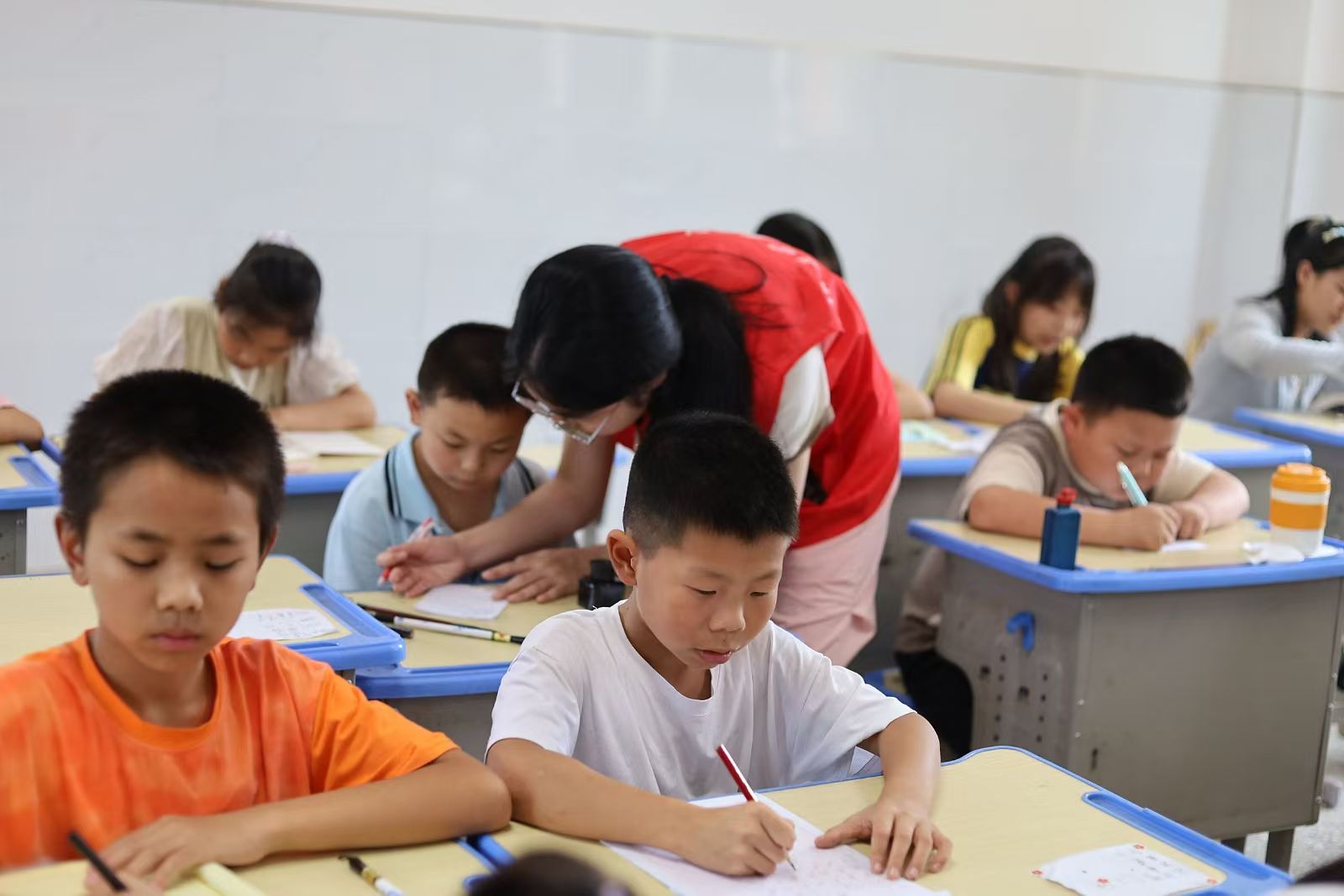 圖為志愿者在向孩子們教授書法和漢字筆順。中國青年網(wǎng) 通訊員 隆瑩瑩 供圖