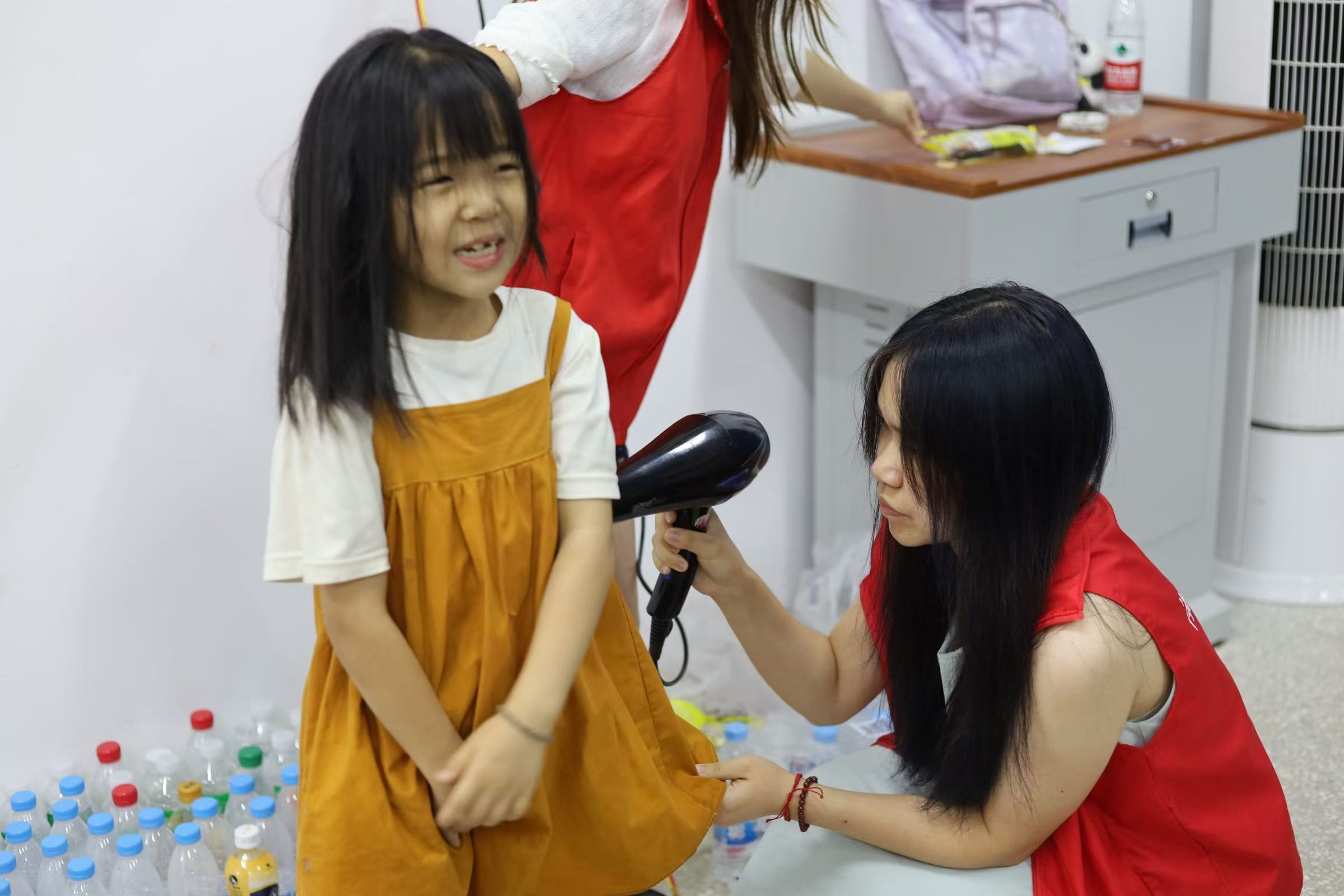 圖為志愿者們?cè)跒楸挥炅軡竦男∨笥汛蹈梢路皖^發(fā)。呂柳霖 供圖