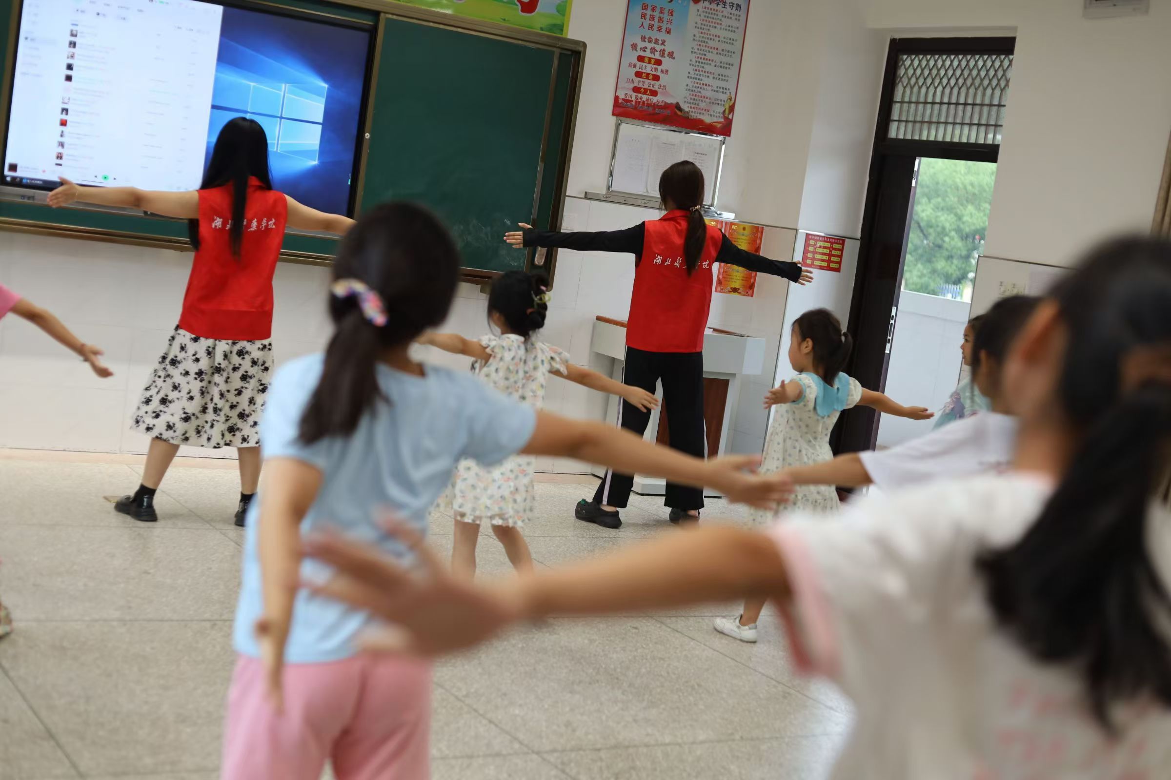 圖為志愿者在教孩子們跳“向快樂出發(fā)”的舞蹈,孩子們都張開雙手跟著志愿者的步伐舞動(dòng)著。隆瑩瑩 供圖