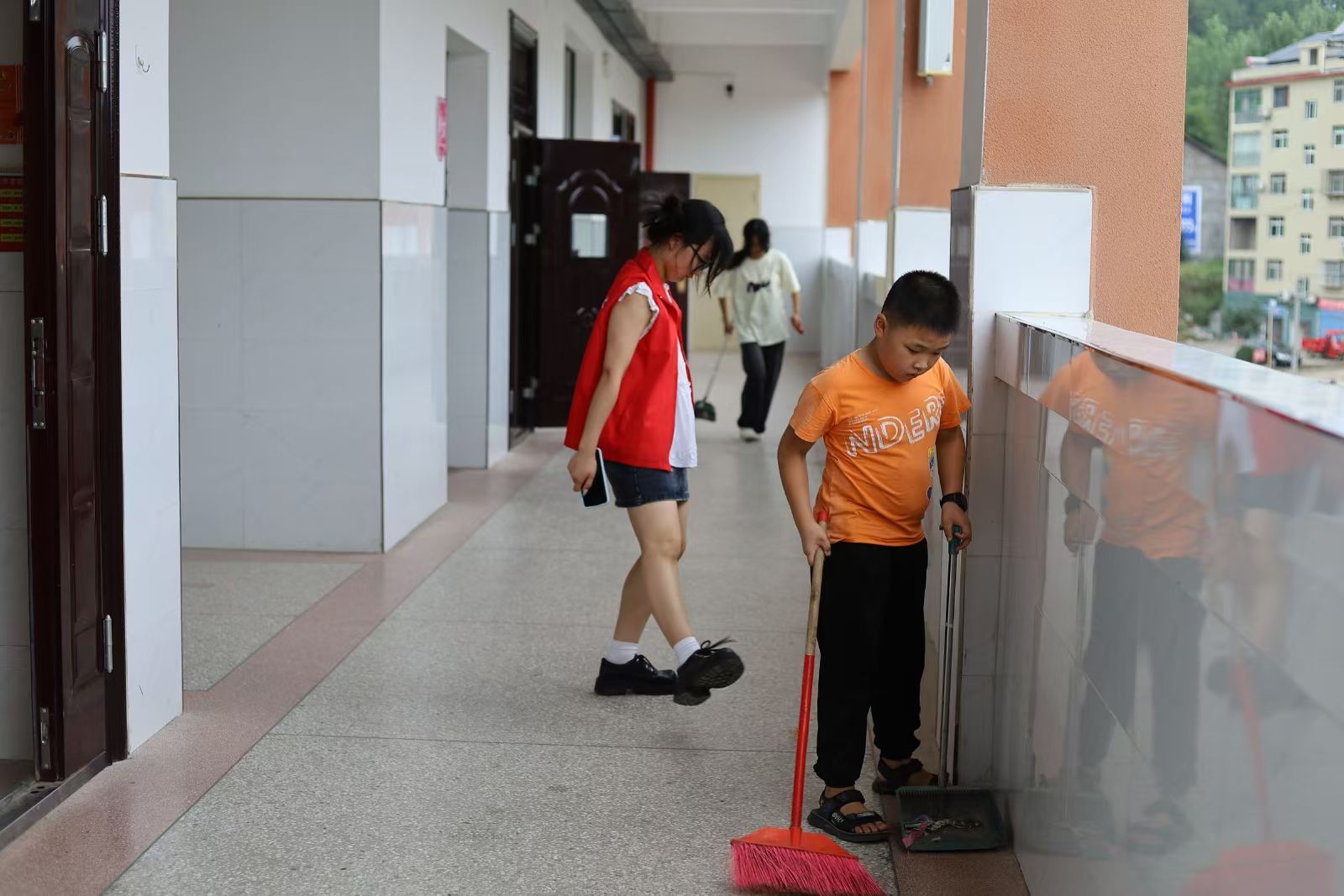 圖為志愿者帶領(lǐng)同學(xué)們上勞動(dòng)課,打掃美麗校園。呂柳霖 供圖
