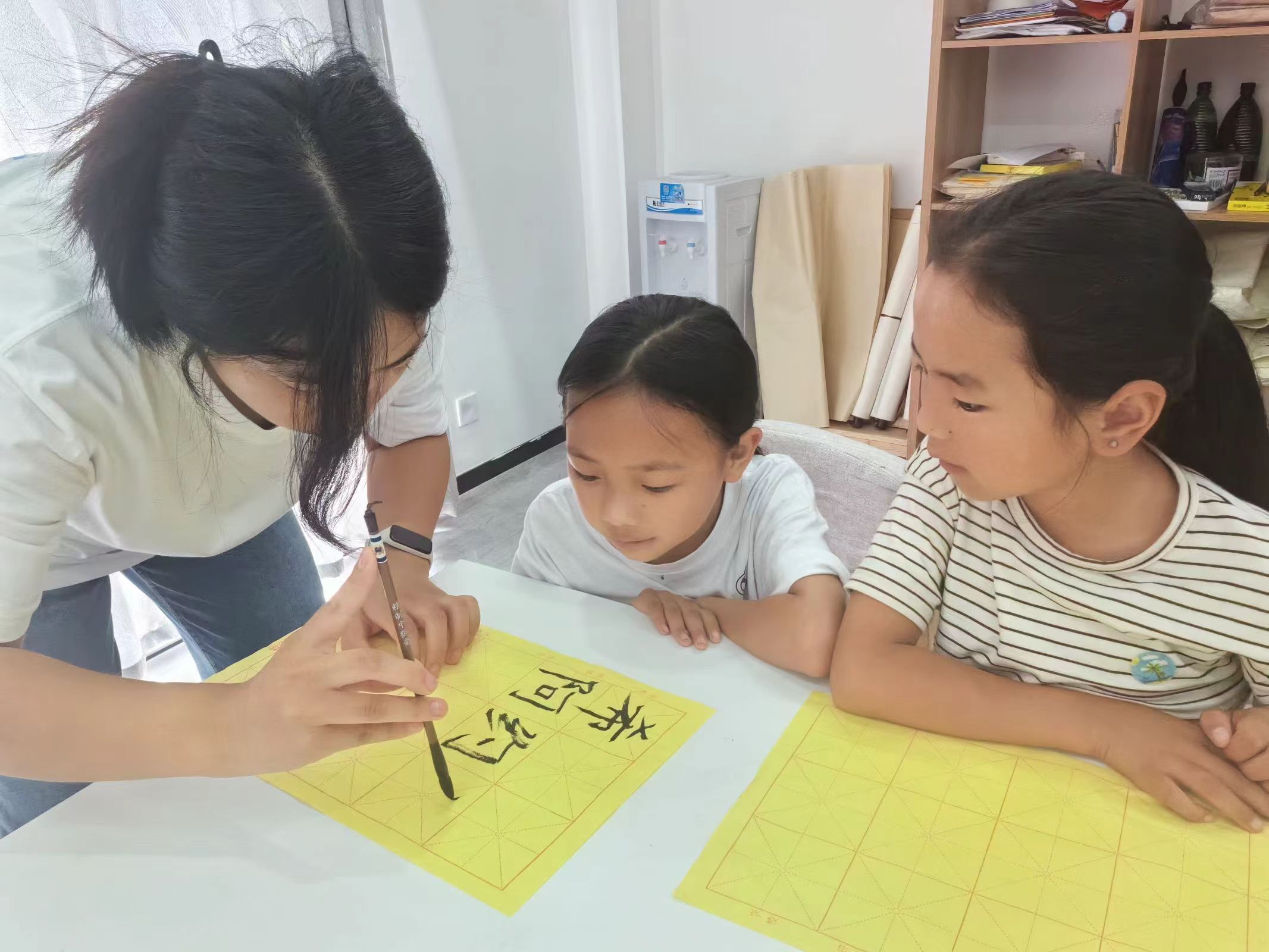 圖為志愿者帶領(lǐng)小朋友寫毛筆字(謝文博攝)