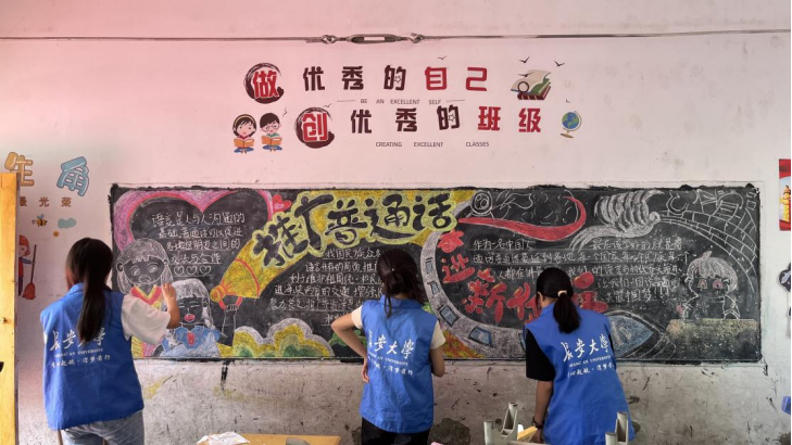 隨著黑板報的完成,孩子們聚集在黑板前,熱烈討論著新內容,彼此間的普通話交流愈發頻繁,他們承諾將積極推廣普通話。支教隊員們深感欣慰,因為他們的努力已初見成效。